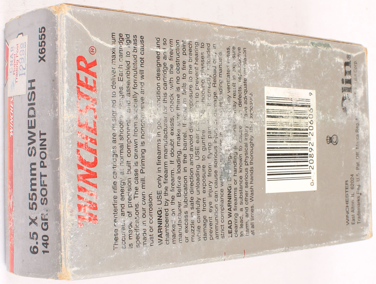 Winchester, Super X, 6.5 x 55mm Swedish, 140 Grain Soft Point, Partial 14rds. Of incorrect ammo, 1pc. Silver red & orange box, box is solid with very good color, shelf wear, some edge & corner wear, end flaps are solid, ammo is excellent. Grade: Very Good - Value: 8 to 40