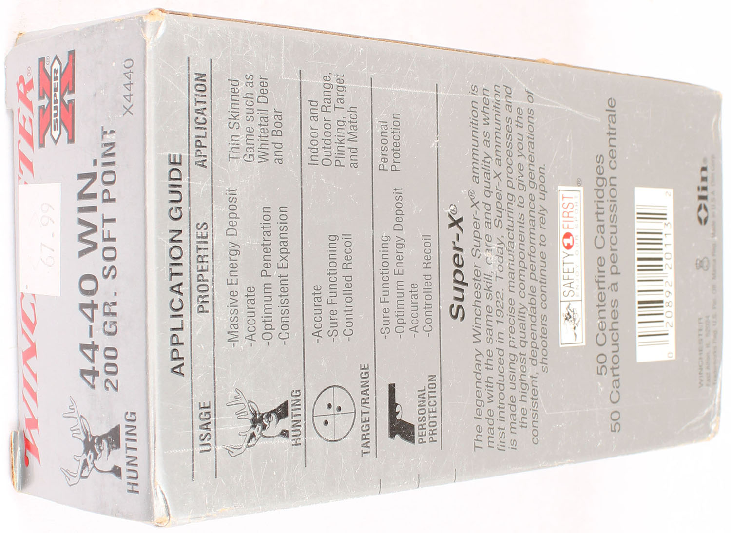 Winchester, Super-X, .44-40 Winchester, 200 Grain Soft Point, Full, 1pc. Silver & red box, box is solid with excellent color, minor shelf & corner wear, very minor edge wear, end flaps are solid, ammo is excellent. Grade: Excellent - Value: 50 to 150