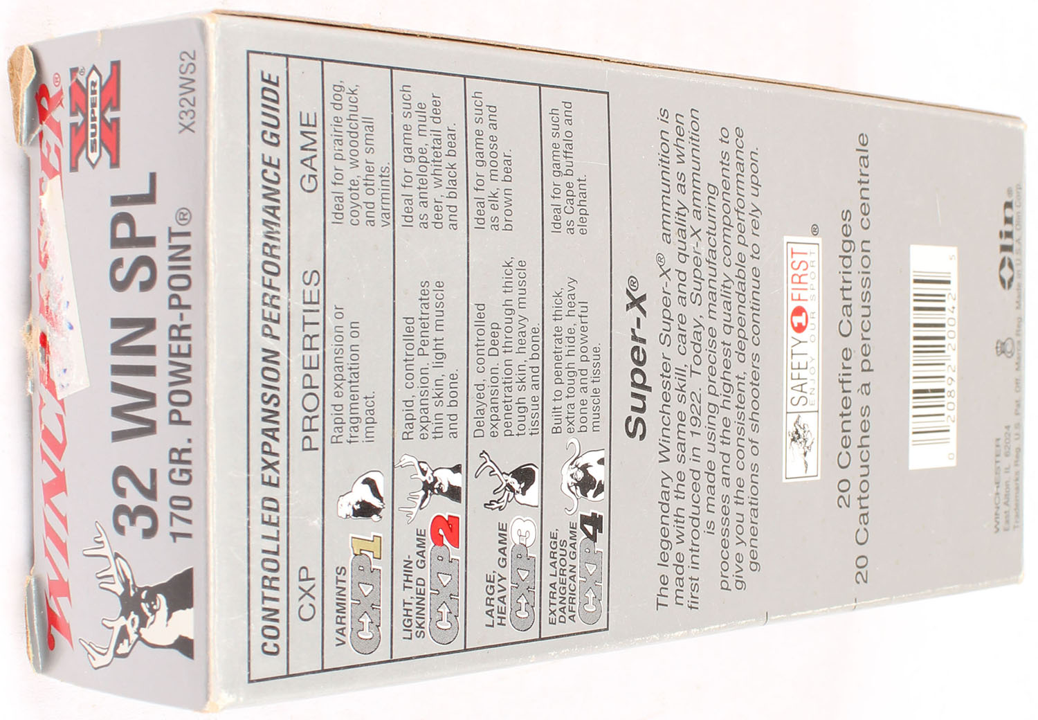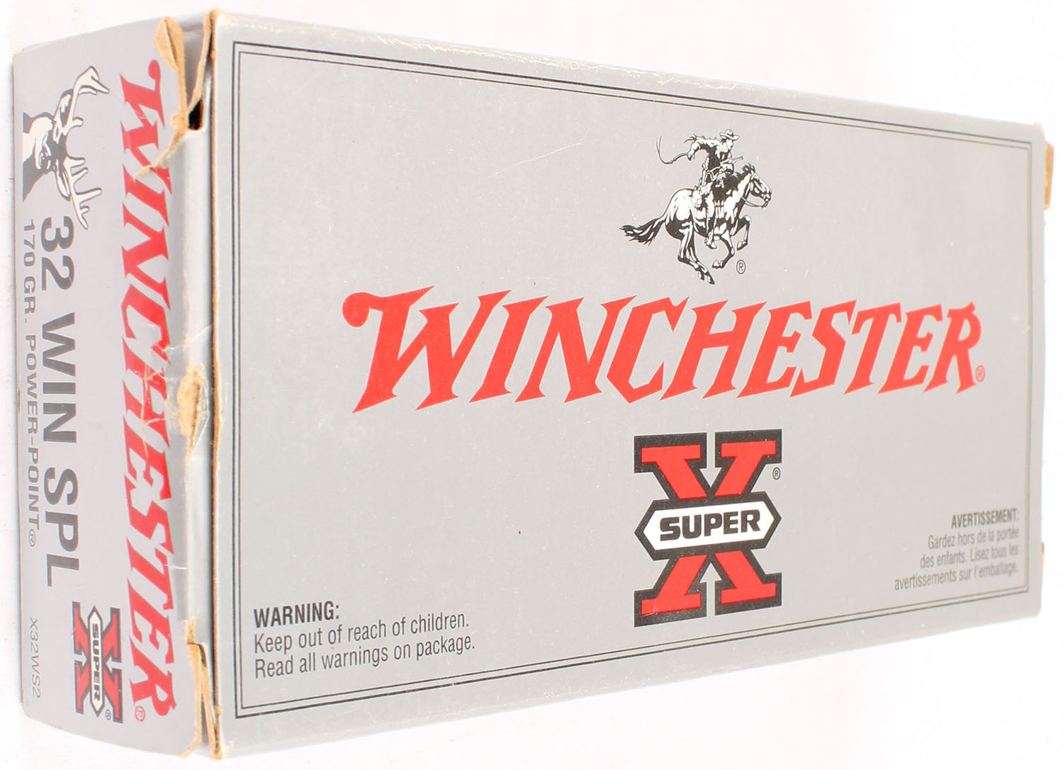 Winchester, Super-X, .32 Winchester Special, 170 Grain Power-Point, Full, 1pc. Silver & red box, box is solid with minty color, very minor shelf & corner wear, edges are crisp, end flaps are solid, ammo is excellent. Grade: Excellent - Value: 20 to 60