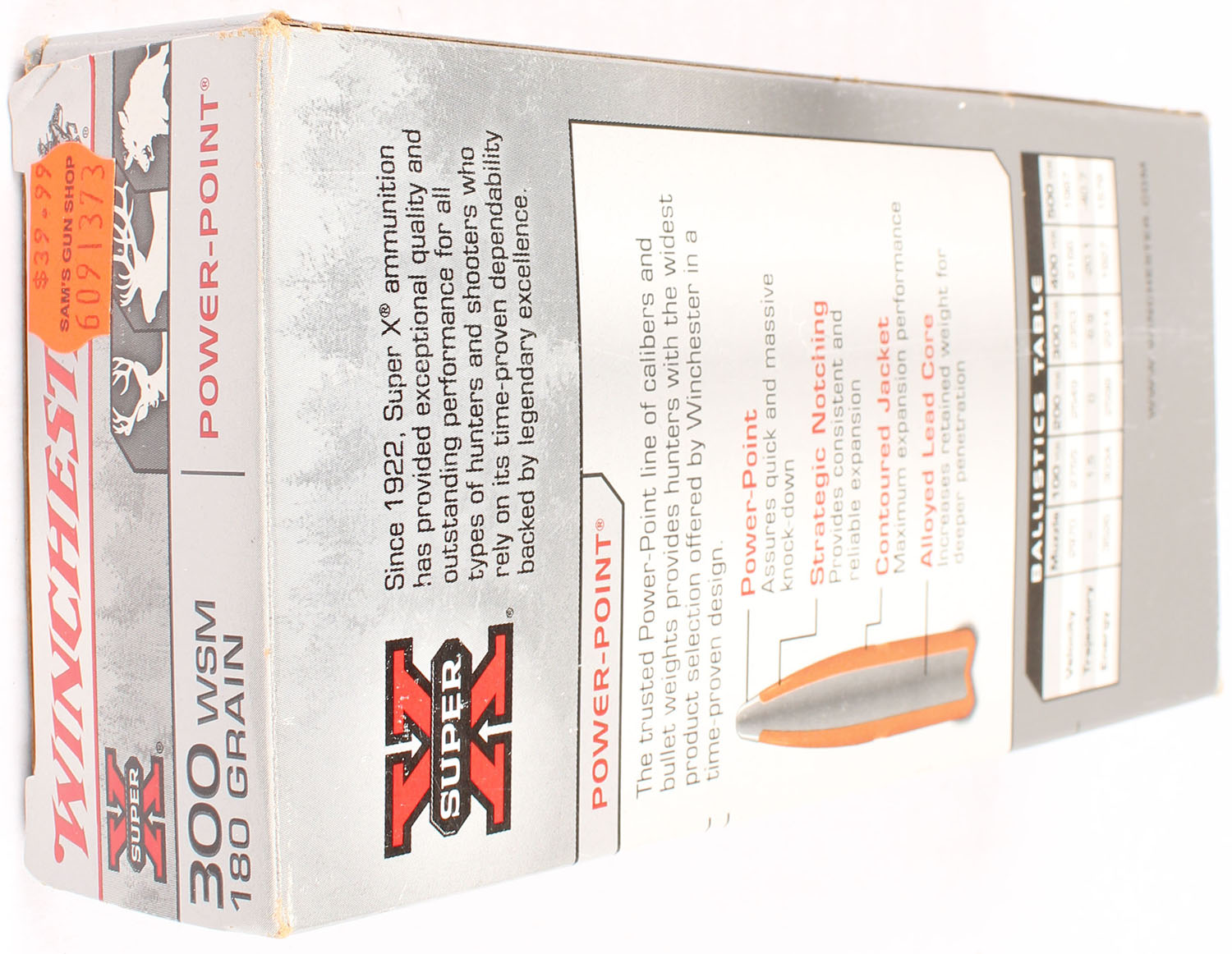 Winchester, Super X, .300 WSM, 180 Grain Power-Point, Full, 1pc. Gray & red box, box is solid with minty color, very minor corner wear, edges are crisp, end flaps are solid, ammo is excellent to minty. Grade: Excellent ++ - Value: 20 to 60