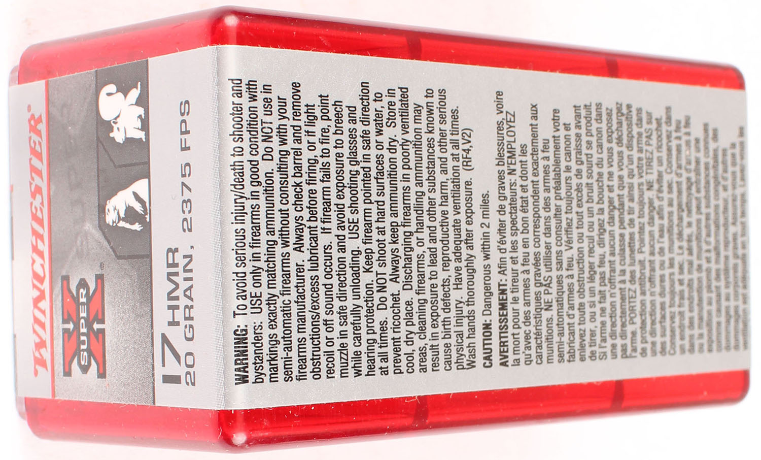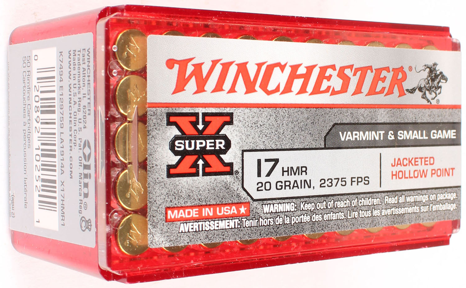 Winchester, Super X, .17 HMR, 20 Grain Jacketed Hollow Point, 2375 FPS, FULL & SEALED, 2pc. Red plastic tray with gray & red sealing label, box is MINT with mint color, label is minty, ammo appears mint. Grade: MINT - Value: 10 to 40