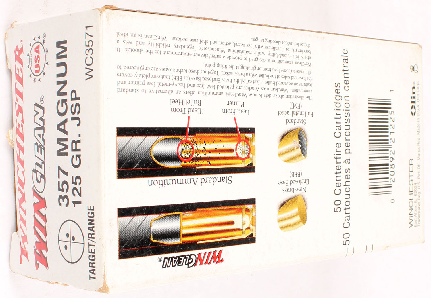 Winchester, WinClean, .357 Magnum, 125 Grain Jacketed Soft Point, Full, 1pc. White & red box, box is solid with excellent color, minor edge & corner wear, end flaps are solid, ammo is minty. Grade: Excellent + - Value: 20 to 60