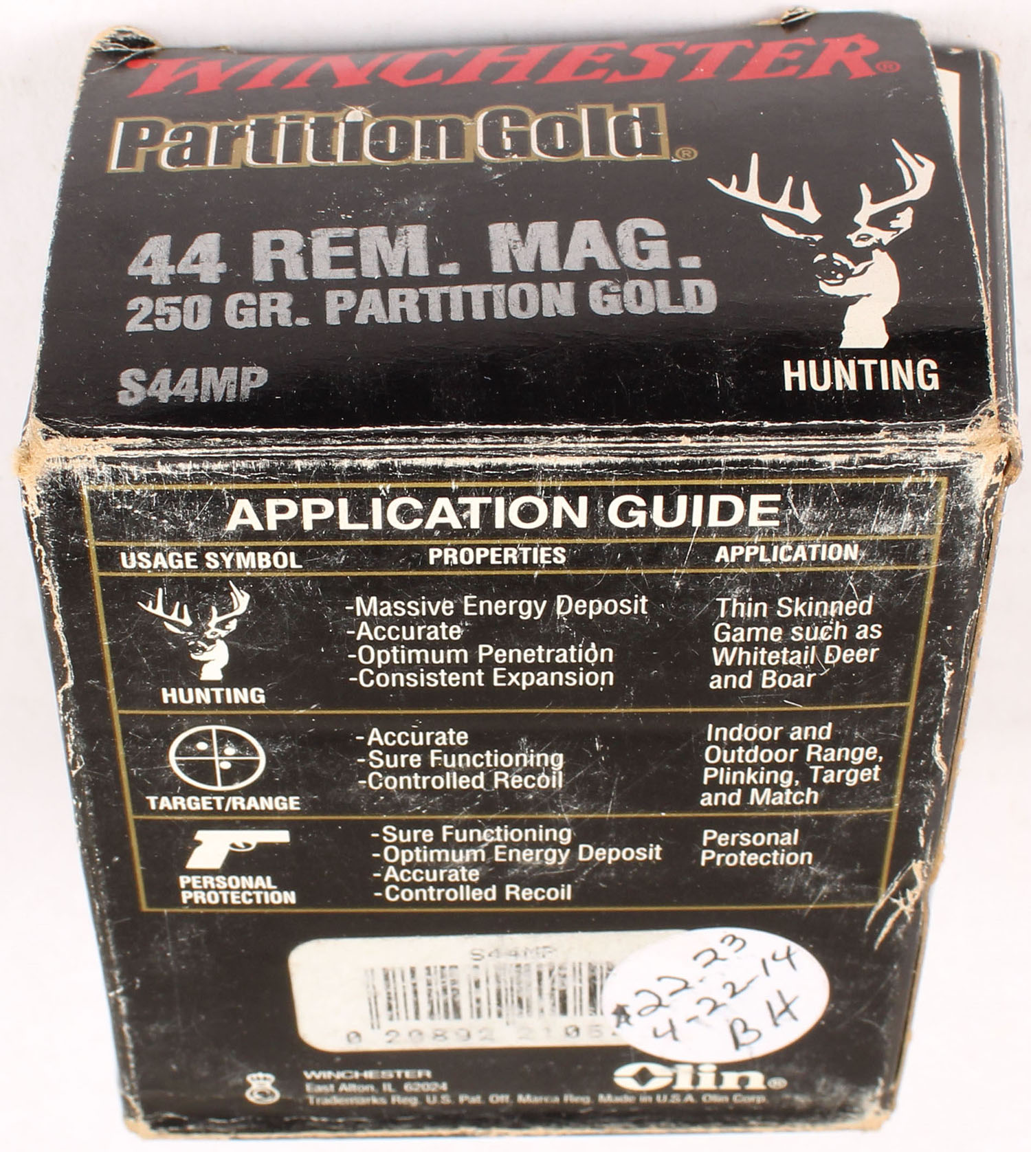 Winchester, Supreme, .44 Rem. Mag., 250 Grain Partition Gold, Partial 18rds. Correct, 1pc. Black box, box is solid with excellent color, edge & corner wear, end flaps are solid, ammo is excellent. Grade: Very Good ++ - Value: 10 to 40