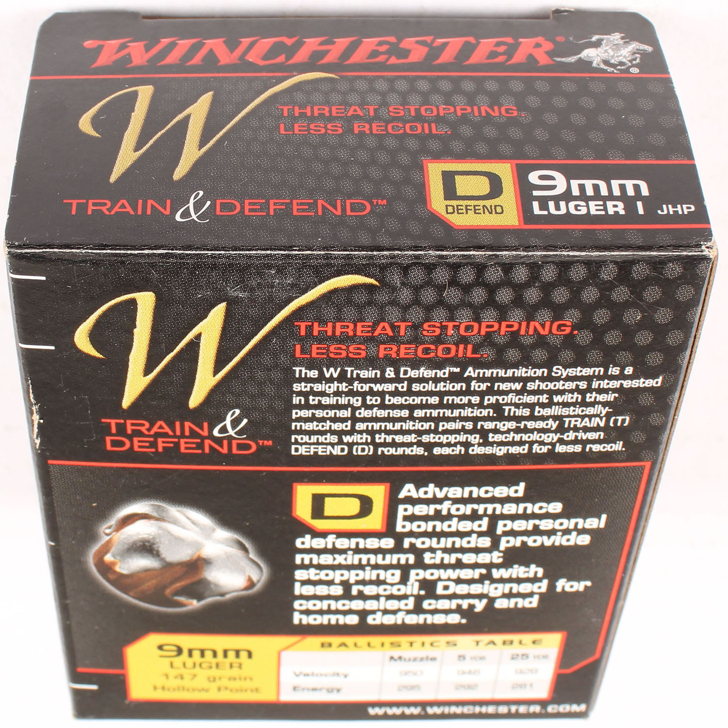 Winchester, Defender, 9mm Luger, 147 Grain Jacketed Hollow Point, Full, 1pc. Black box, box is solid with minty color, very minor corner wear, edges are crisp, end flaps are solid, ammo is excellent. Grade: Excellent + - Value: 10 to 40
