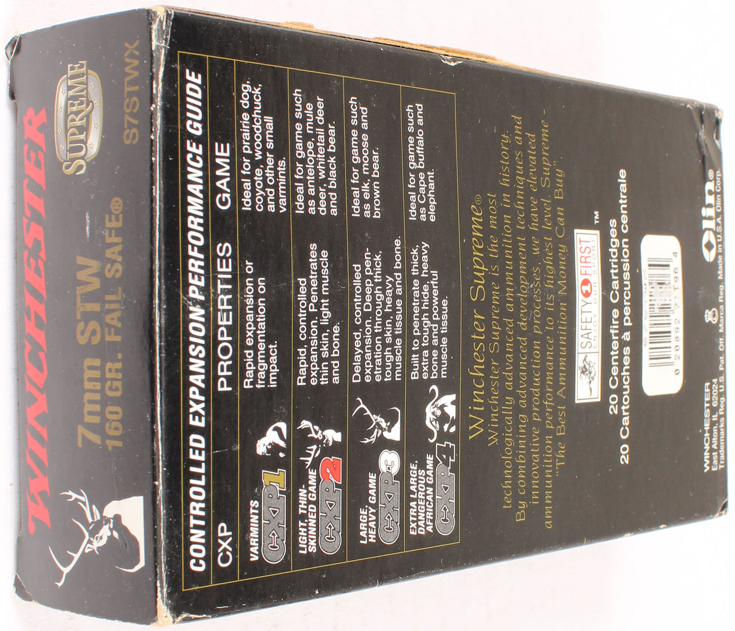 Winchester, Supreme, 7mm STW, 160 Grain Fail Safe, Full, 1pc. Black box, box is solid with excellent color, minor shelf & corner wear, very minor edge wear, end flaps are solid, ammo is minty. Grade: Excellent + - Value: 20 to 60
