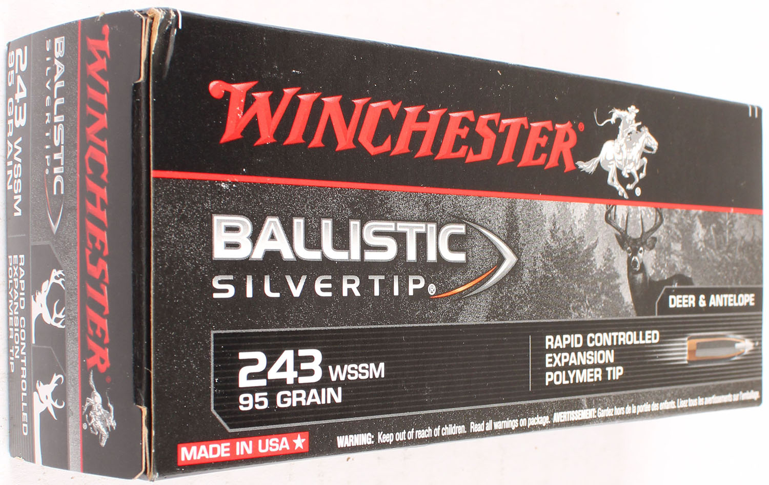 Winchester, Ballistic Silvertip, 243 WSSM, 95 Grain Rapid Controlled Expansion Polymer Tip, Full, 1pc. Black box, box is MINT with minty color, corners are sharp, edges are crisp, end flaps are solid, ammo is minty. Grade: MINT - Value: 20 to 60