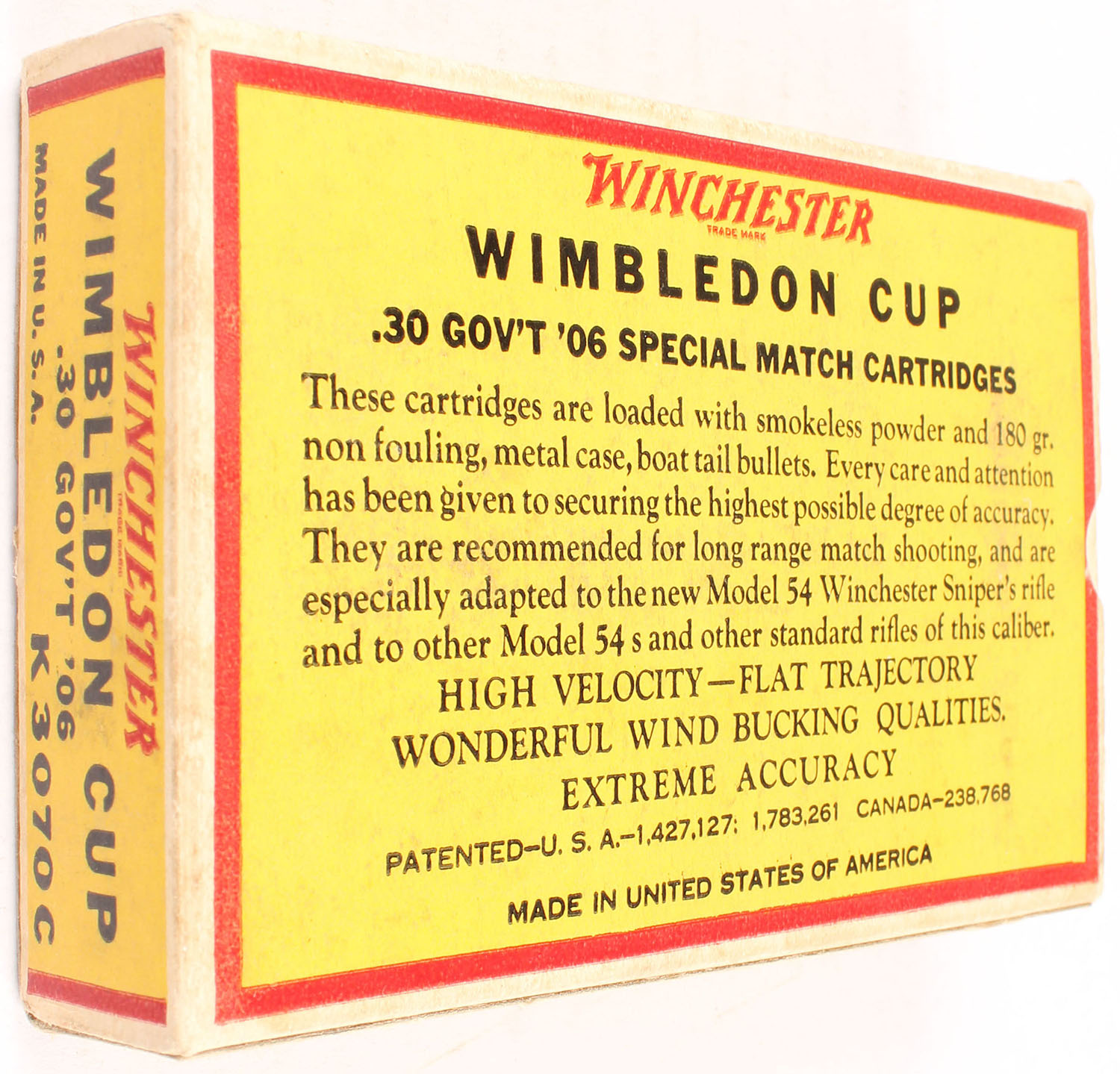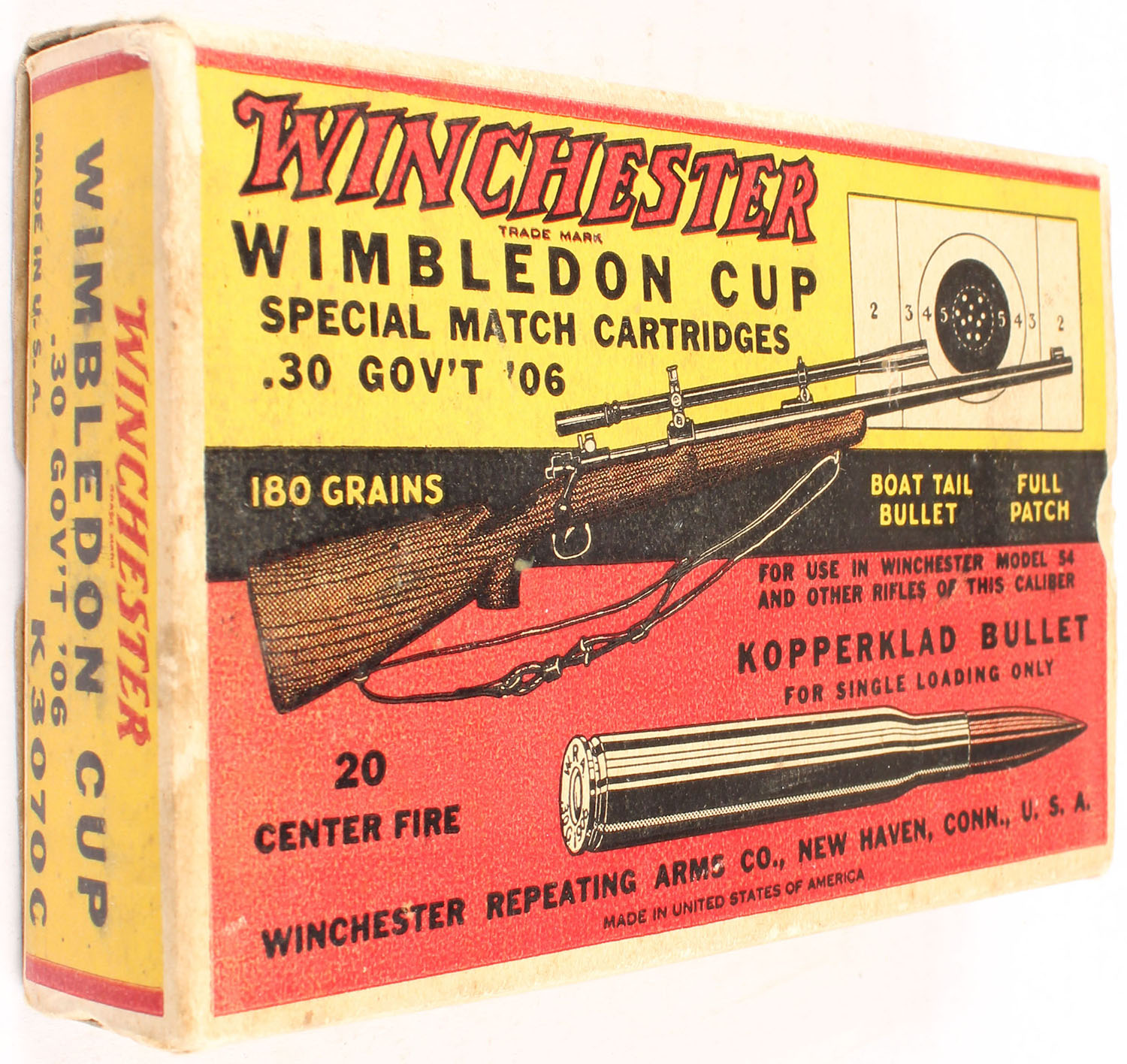 RARE! Winchester, Wimbledon Cup, .30 Gov't '06 (.30-06), Special Match Cartridges, 180 Grain Full Patch Boat Tail Bullet, Full, 1pc. Red yellow & black box, box is solid with very good to excellent color, some age soiling, very minor corner wear, edges are mostly crisp, end flaps are solid, ammo is excellent. Grade: Excellent - Value: 100 to 300
