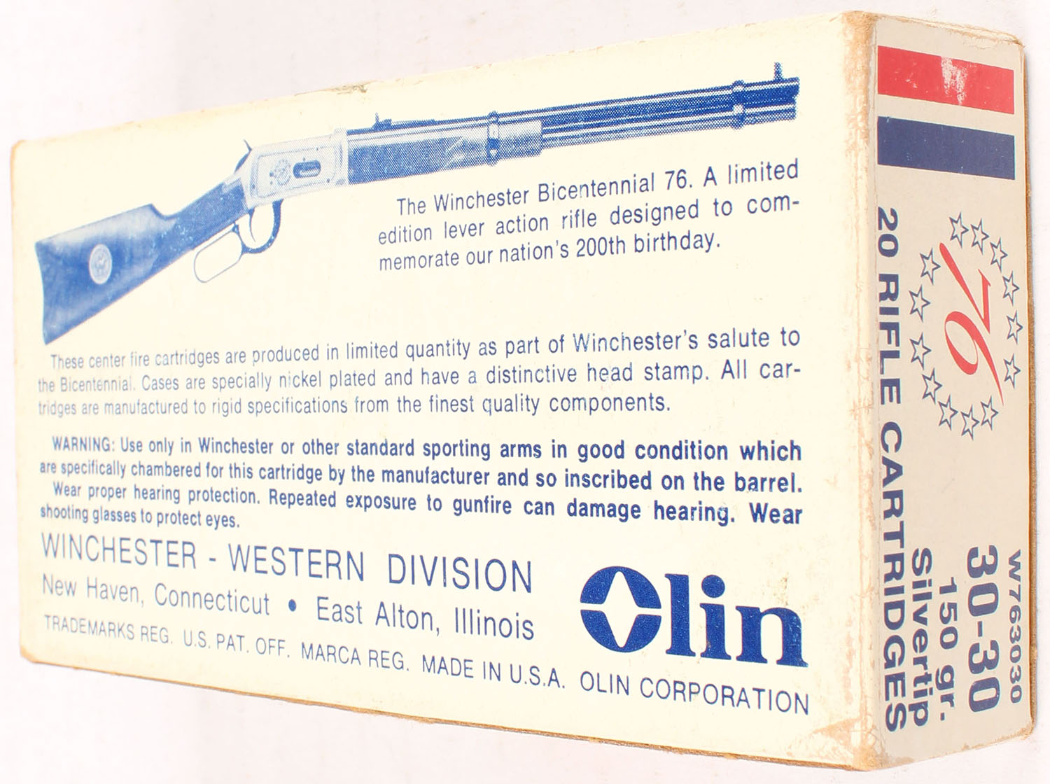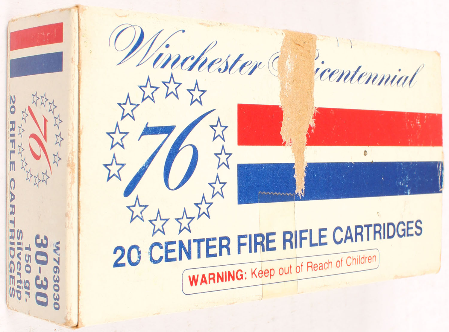 Winchester, Bicentennial, .30-30 Winchester, 150 Grain Silvertip, Full, 1pc. White blue & red box, box is solid with very good color, minor age soiling, scuff on top, tape on front side, minor edge & corner wear, end flaps are solid, ammo is minty. Grade: Very Good ++ - Value: 20 to 60