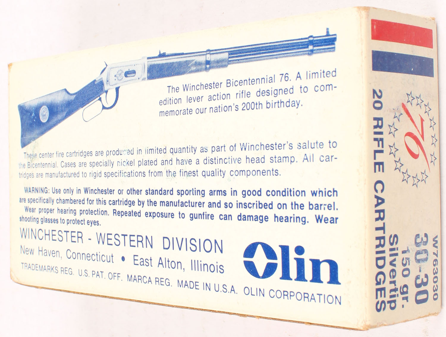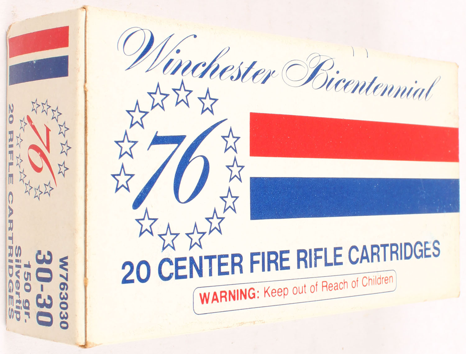 Winchester, Bicentennial, .30-30 Winchester, 150 Grain Silvertip, Full, 1pc. White blue & red box, box is solid with very good to excellent color, some age soiling, very minor edge & corner wear, end flaps are solid, ammo is minty. Grade: Excellent - Value: 20 to 60