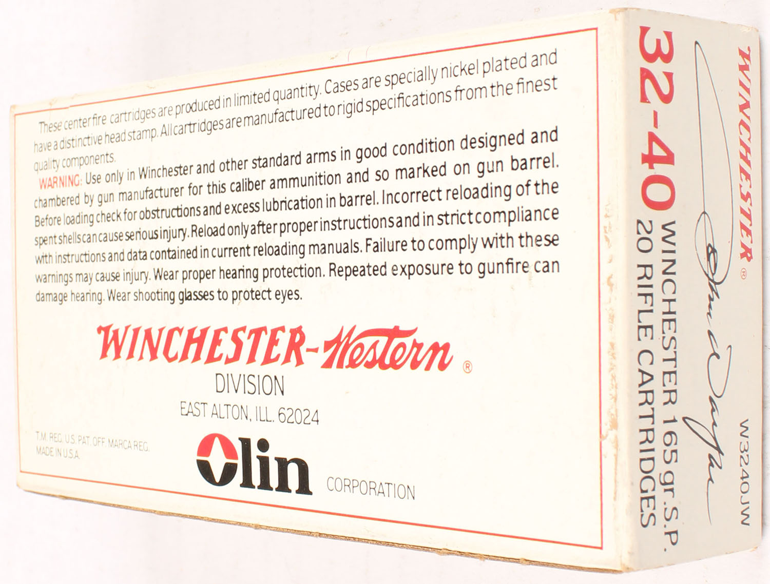 Winchester, John Wayne, .32-40 Winchester, 165 Grain Soft Point, Full, 1pc. White box featuring John Wayne, box is solid with excellent color, very minor shelf & corner wear, edges are crisp, end flaps are solid, ammo is minty. Grade: Excellent + - Value: 40 to 120