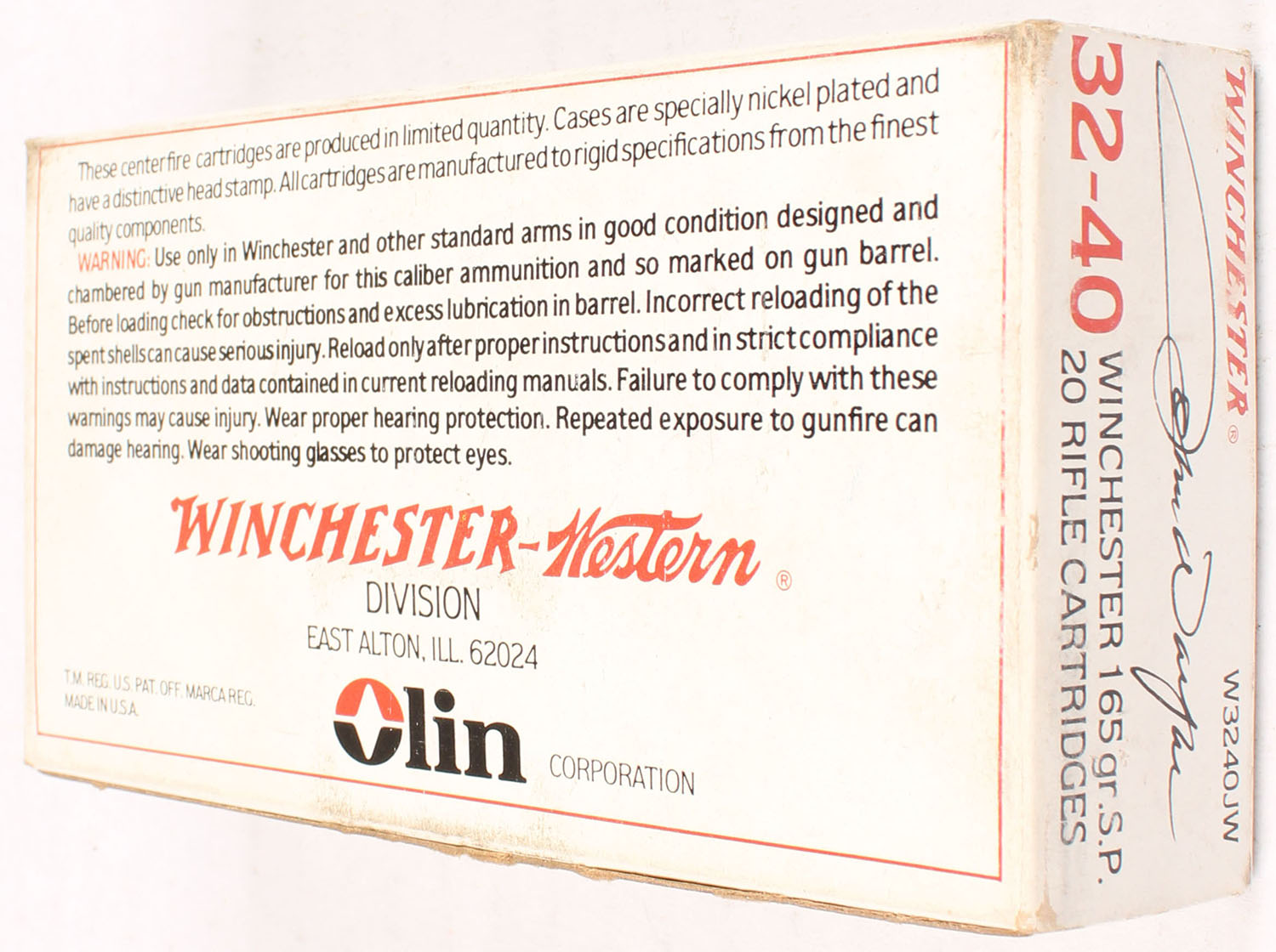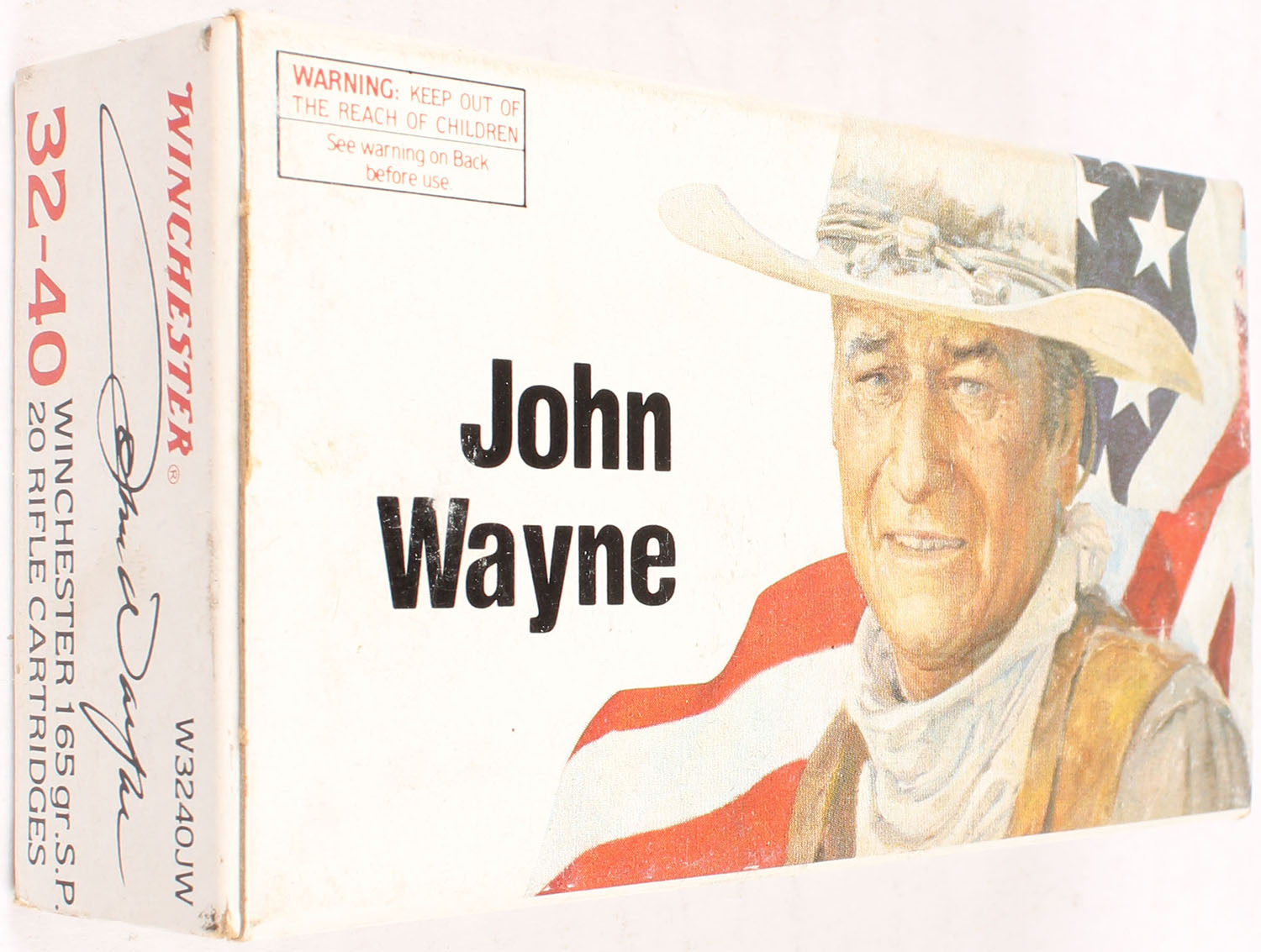 Winchester, John Wayne, .32-40 Winchester, 165 Grain Soft Point, Full, 1pc. White box featuring John Wayne, box is solid with excellent color, very minor shelf wear, corners are mostly sharp, edges are crisp, end flaps are solid, ammo is minty. Grade: Excellent - Value: 40 to 120