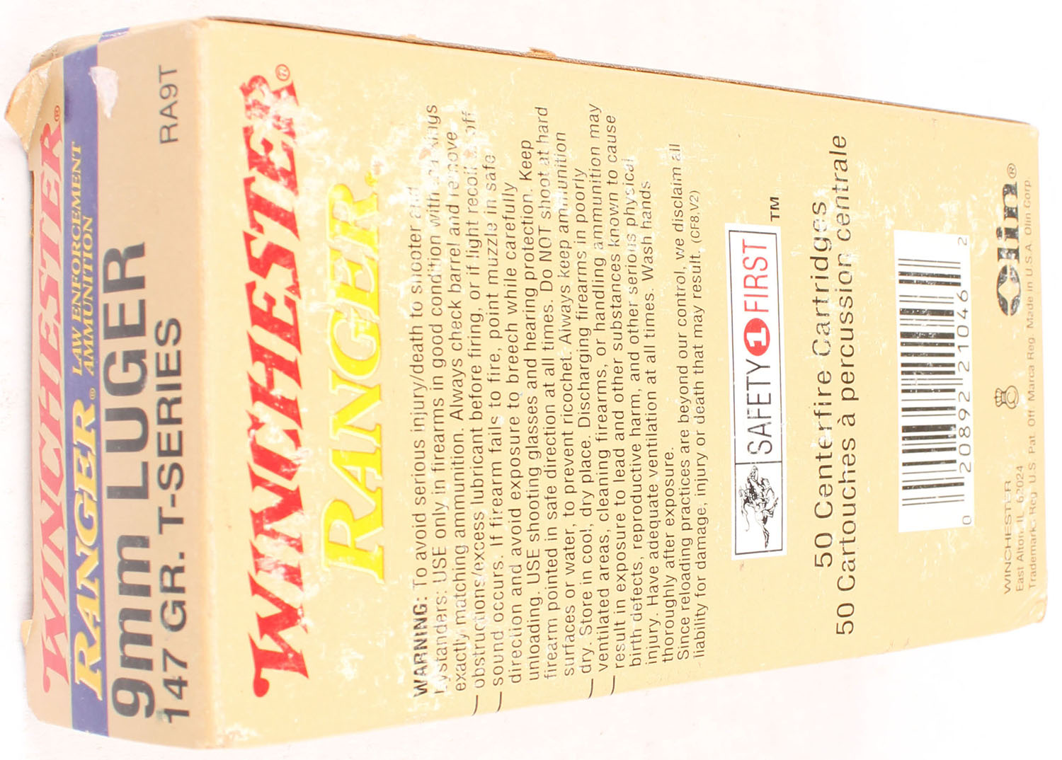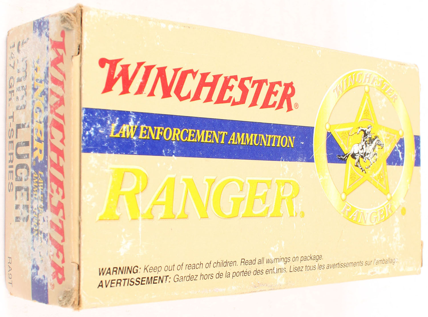 Winchester, Ranger, 9mm Luger, 147 Grain T-Series, Full, 1pc. Brown yellow & blue box, box is solid with excellent color, shelf wear, minor corner wear, edges are mostly crisp, end flaps are solid, ammo is minty. Grade: Excellent - Value: 20 to 60