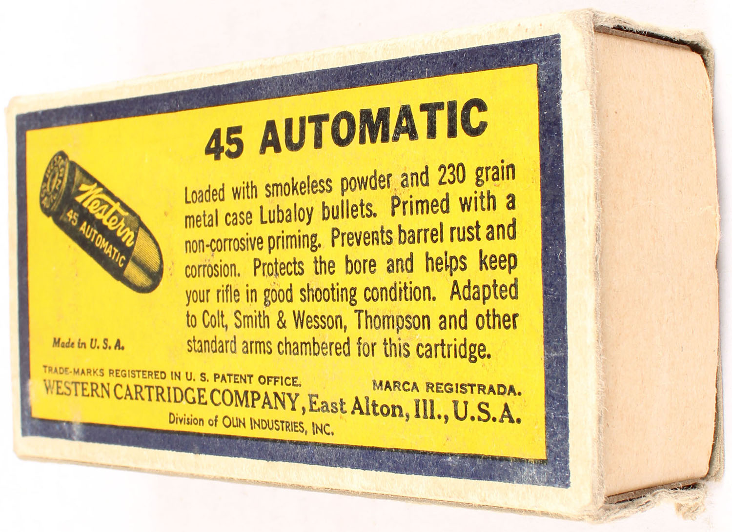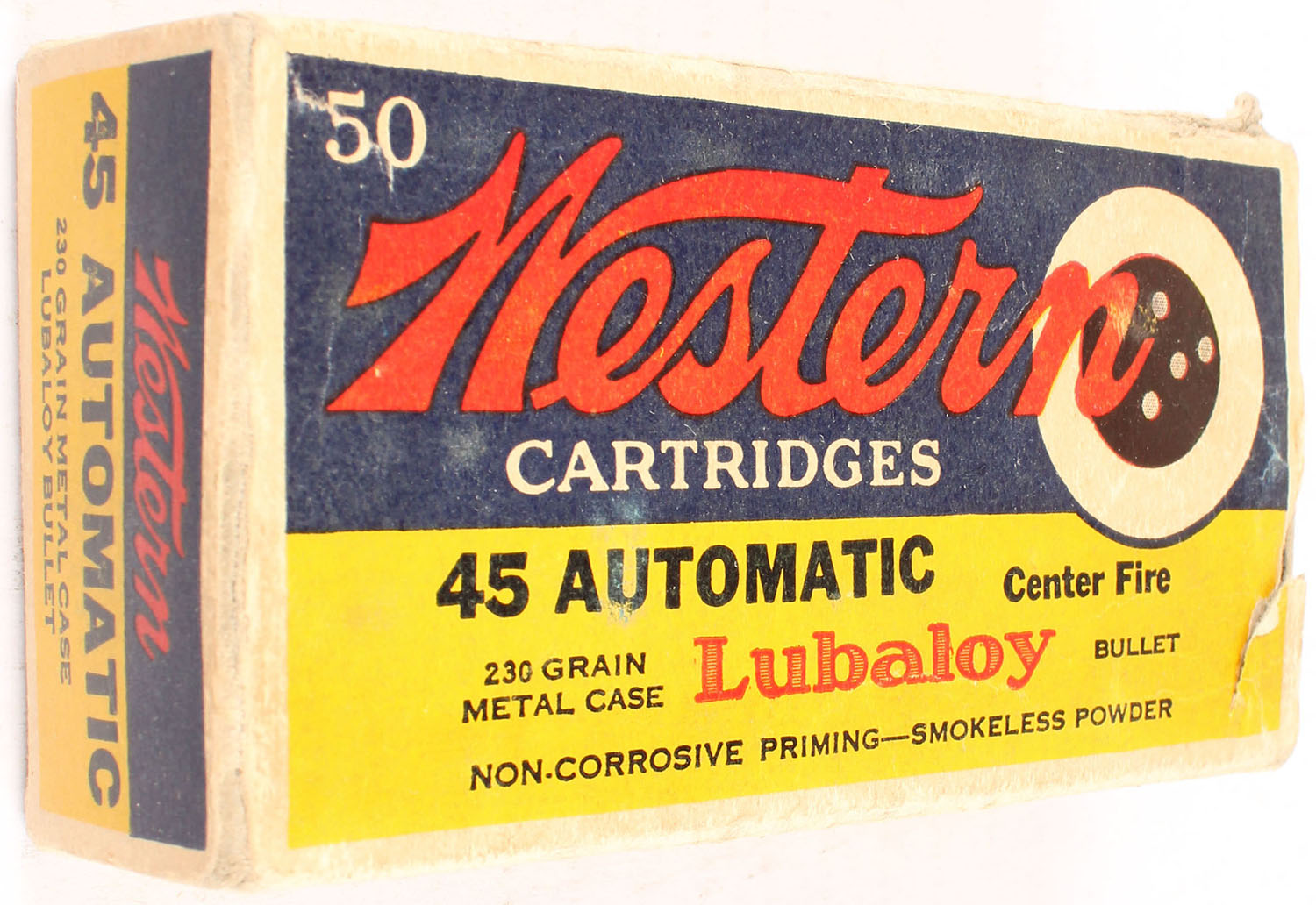 Western, Lubaloy, .45 Automatic, 230 Grain Full Metal Case Lubaloy Bullet, Full, 1pc. Blue yellow & red bulls eye box, missing right end flap, box has very good color, some age soiling & corner wear, minor edge wear, left end flap is solid, ammo is excellent. Grade: Very Good - Value: 20 to 60