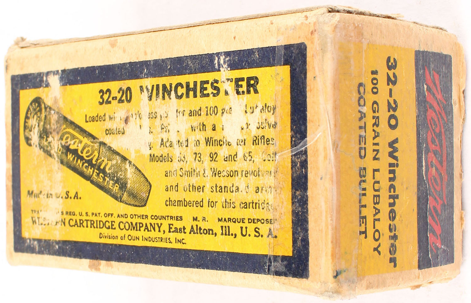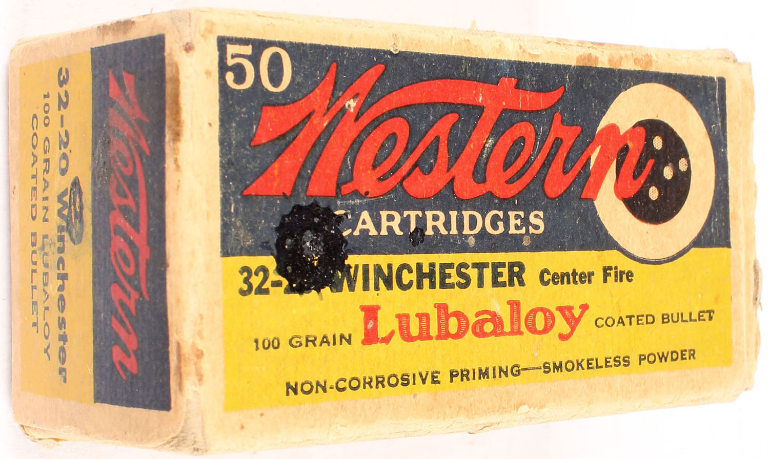 Western, Lubaloy, .32-20 Winchester, 100 Grain Lubaloy Coated Bullet, Full, 1pc. Blue yellow & red box, box is solid with good to very good color, age soiling, staining on top, some edge & corner wear, end flaps are solid, ammo is very good to excellent. Grade: Good ++ - Value: 40 to 120