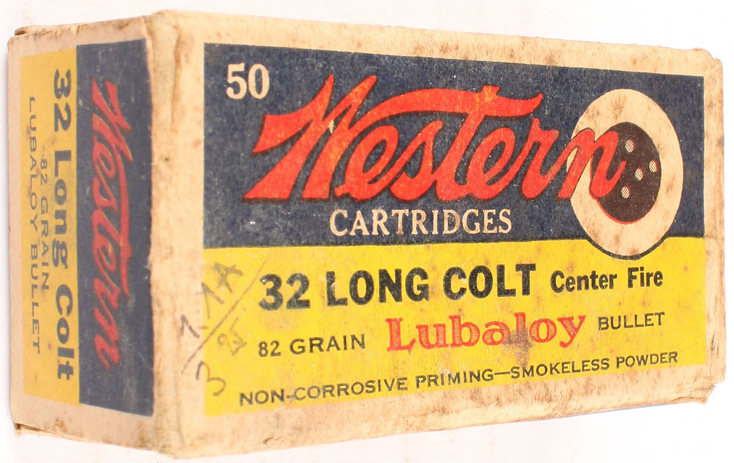Western, Lubaloy, .32 Long Colt, 82 Grain Lubaloy Bullet, Full, 1pc. Blue yellow & red bulls eye box, box is solid with good color, age soiling, corner wear, some edge wear, staining throughout, top has been written on, end flaps are solid, ammo is excellent. Grade: Good + - Value: 20 to 80