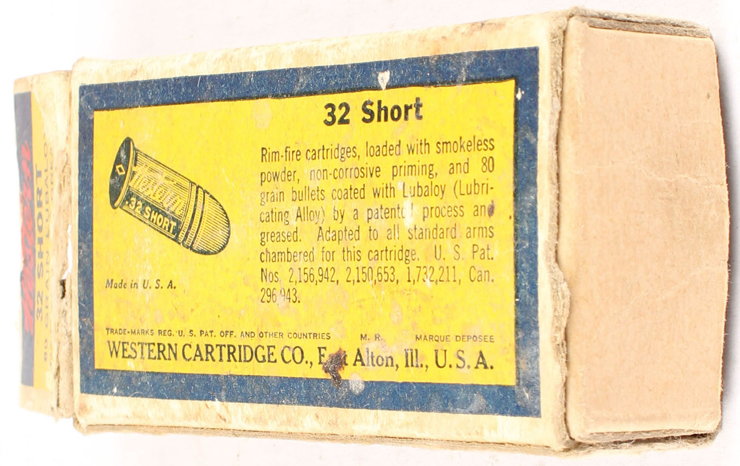Western, Lubaloy, .32 Short Rim Fire, 80 Grain Lubaloy Coated Bullet, Full, 1pc. Blue yellow & red bulls eye box, missing right end flap, left end flap is missing insert tab, very good color, some age soiling, scuff on top, some edge & corner wear, ammo is very good. Grade: Good - Value: 30 to 90
