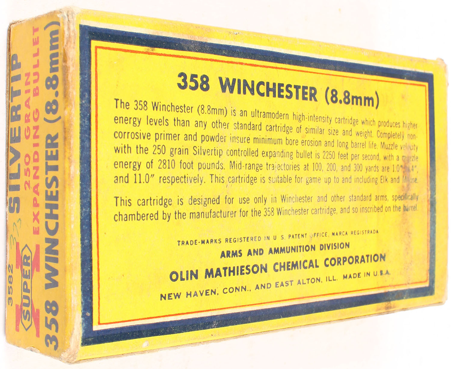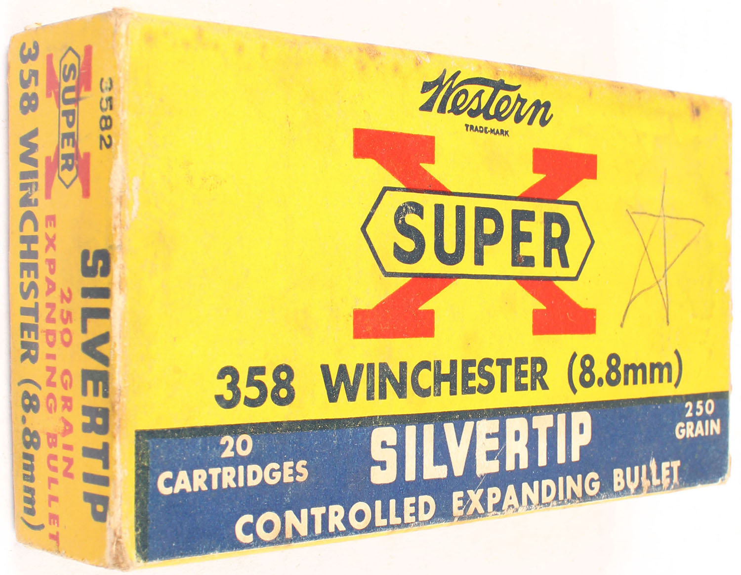 Western, Super X Silvertip, .358 Winchester (8.8mm), 250 Grain Controlled Expanding Bullet, Partial 15rds., 1pc. Yellow blue & red box, box is solid with very good color, age soiling, some staining, some edge & corner wear, top has been written on, end flaps are solid, ammo is excellent. Grade: Very Good - Value: 10 to 50