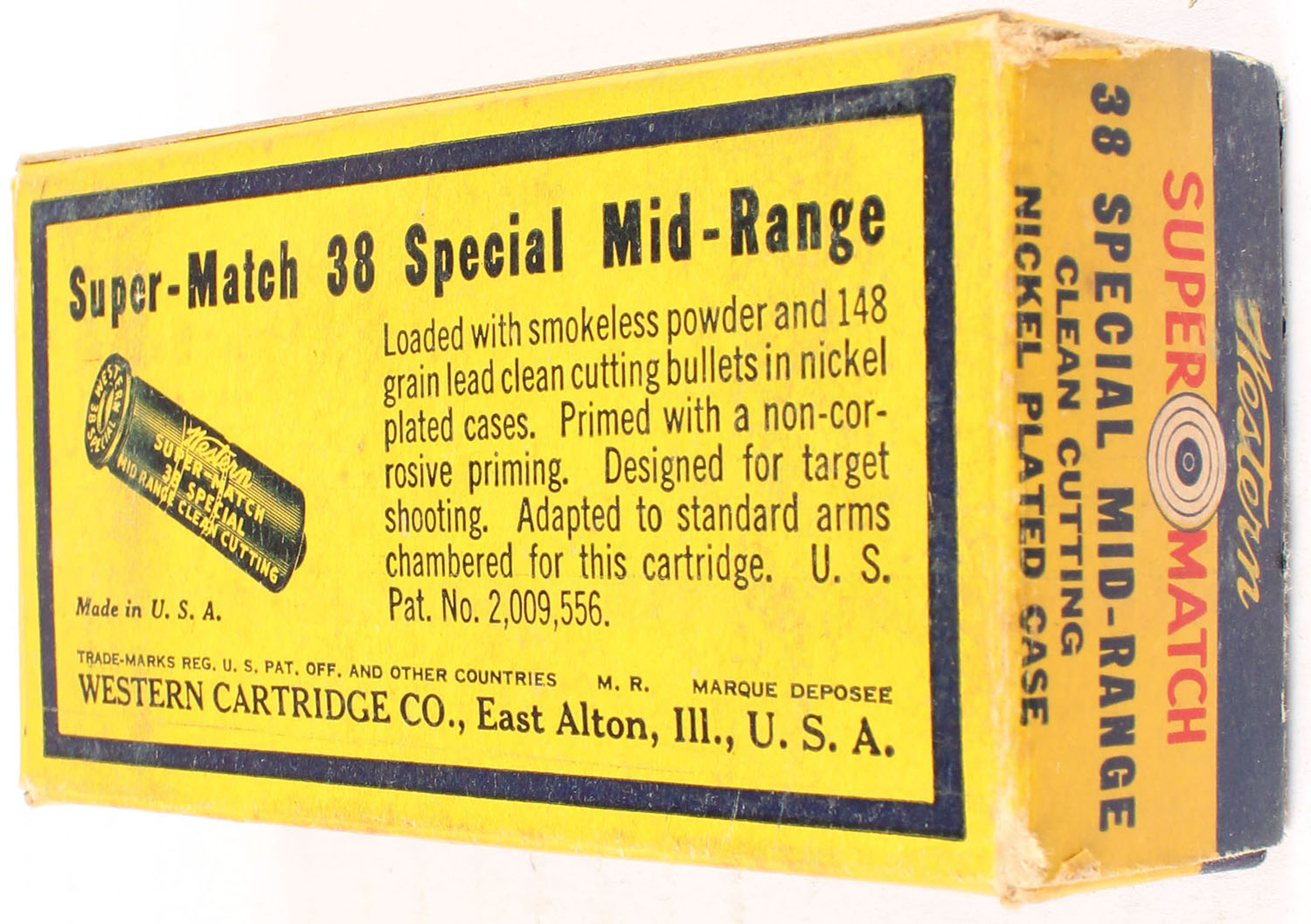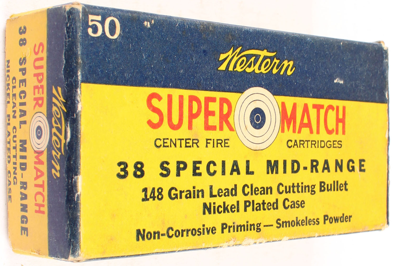 Western, Super Match, .38 Special Mid-Range, 148 Grain Lead Clean Cutting Bullet, Full, 1pc. Yellow blue & red box, box is solid with very good to excellent color, minor age soiling, some edge & corner wear, end flaps are solid, ammo is excellent. Grade: Excellent - Value: 10 to 40