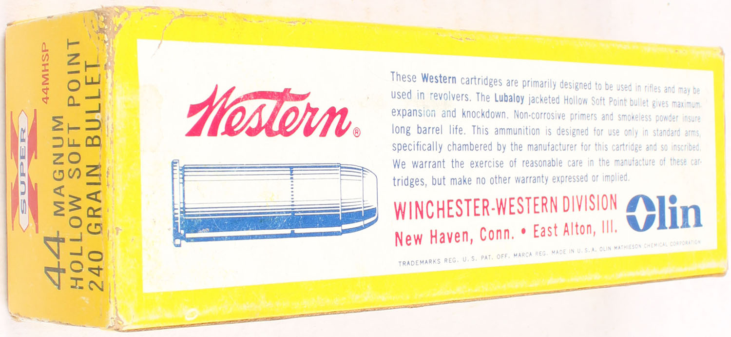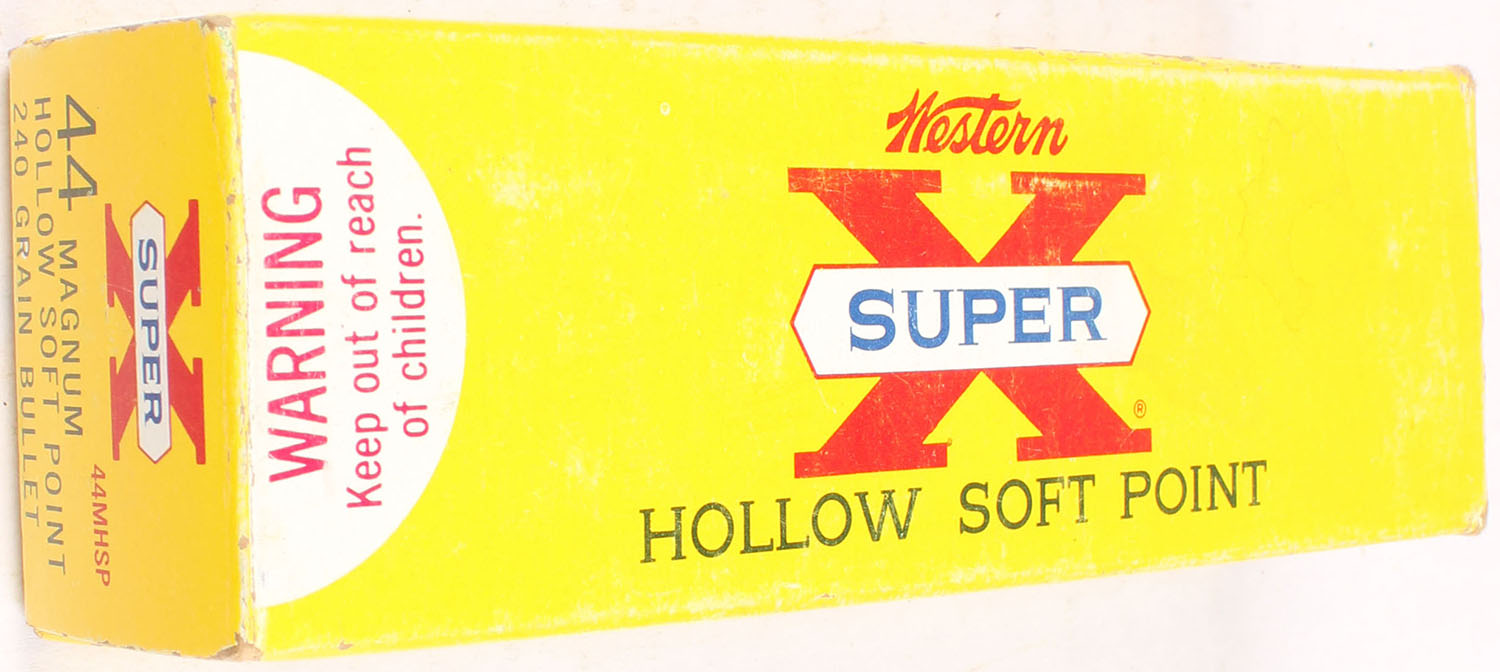 Western, Super X, .44 Magnum, 240 Grain Hollow Soft Point, Ful, 1pc. Yellow white & red box, box is solid with excellent color, minor shelf & corner wear, very minor edge wear, end flaps are solid, ammo is excellent. Grade: Excellent + - Value: 20 to 60