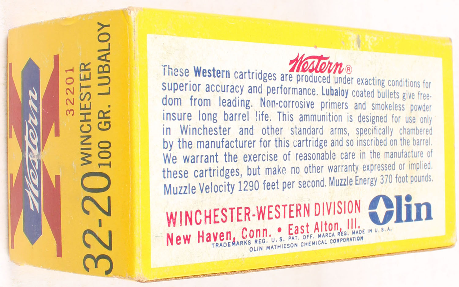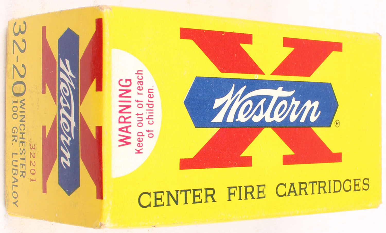 Western, X, .32-20 Winchester, 100 Grain Lubaloy, Full, 1pc. Yellow white & red box, box is near mint with minty color, only very minor shelf wear on bottom, corners are sharp, edges are crisp, end flaps are solid, ammo is excellent. Grade: MINT - Value: 50 to 150
