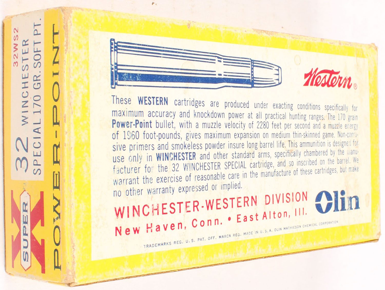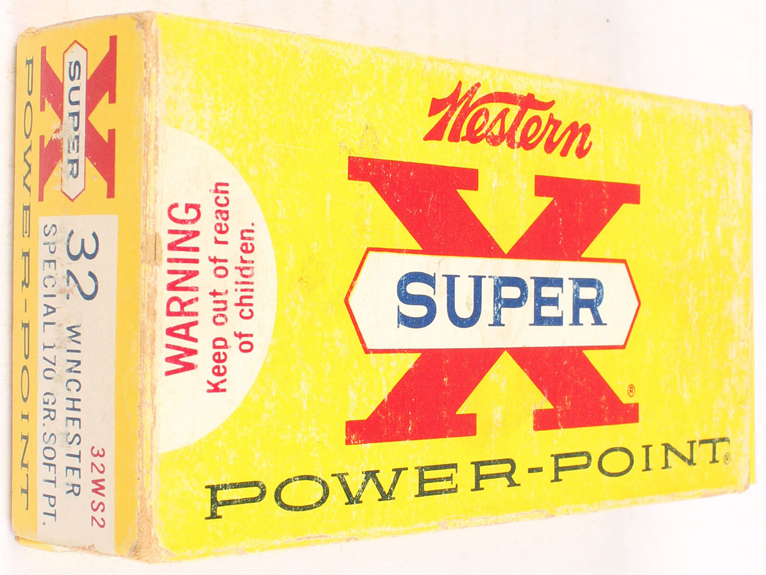 Western, Super X Power-Point, .32 Winchester Special, 170 Grain Soft Point Bullet, Full, 1pc. Yellow white & red box, box is solid with very good color, very minor age soiling, shelf wear, some edge & corner wear, end flaps are solid, ammo is excellent. Grade: Very Good ++ - Value: 20 to 60