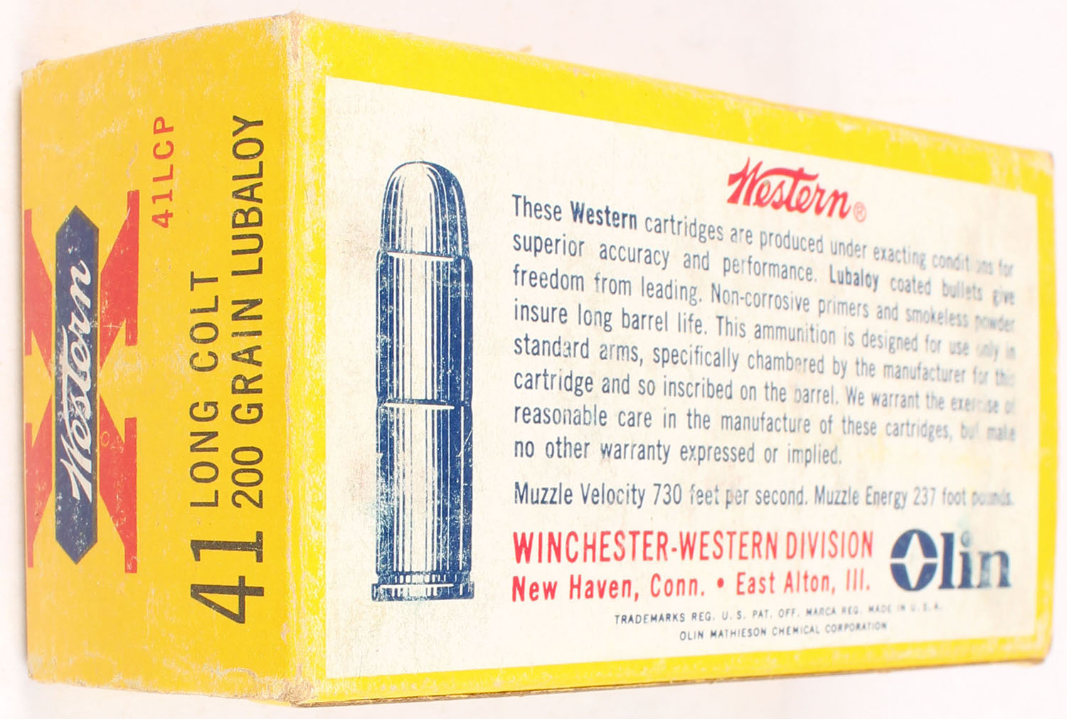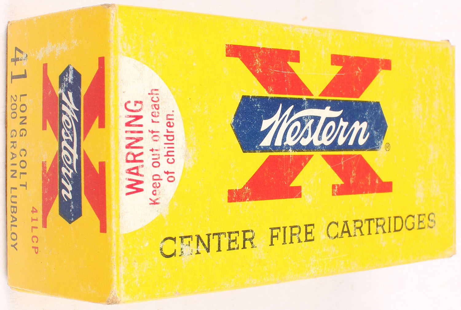 Western, X, .41 Long Colt, 200 Grain Lubaloy, Full, 1pc. Yellow white & red box, box is solid with very good to excellent color, very minor age soiling, some shelf wear, minor corner wear, edges are mostly crisp, end flaps are solid, ammo is excellent. Grade: Excellent - Value: 80 to 240
