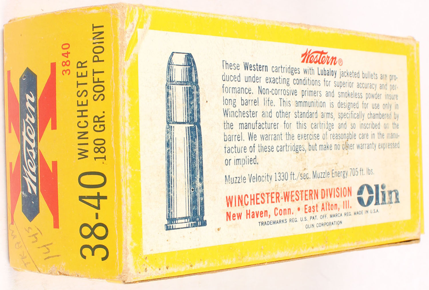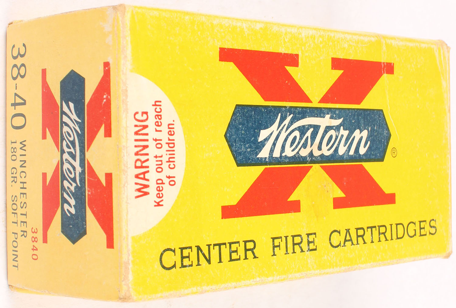 Western, X, .38-40 Winchester, 180 Grain Soft Point, Full of mixed H/S, 1pc. Yellow white & red box, box is solid with excellent color, very minor age soiling, stain on top, some edge & corner wear, end flaps are solid, ammo is excellent. Grade: Excellent - Value: 20 to 60