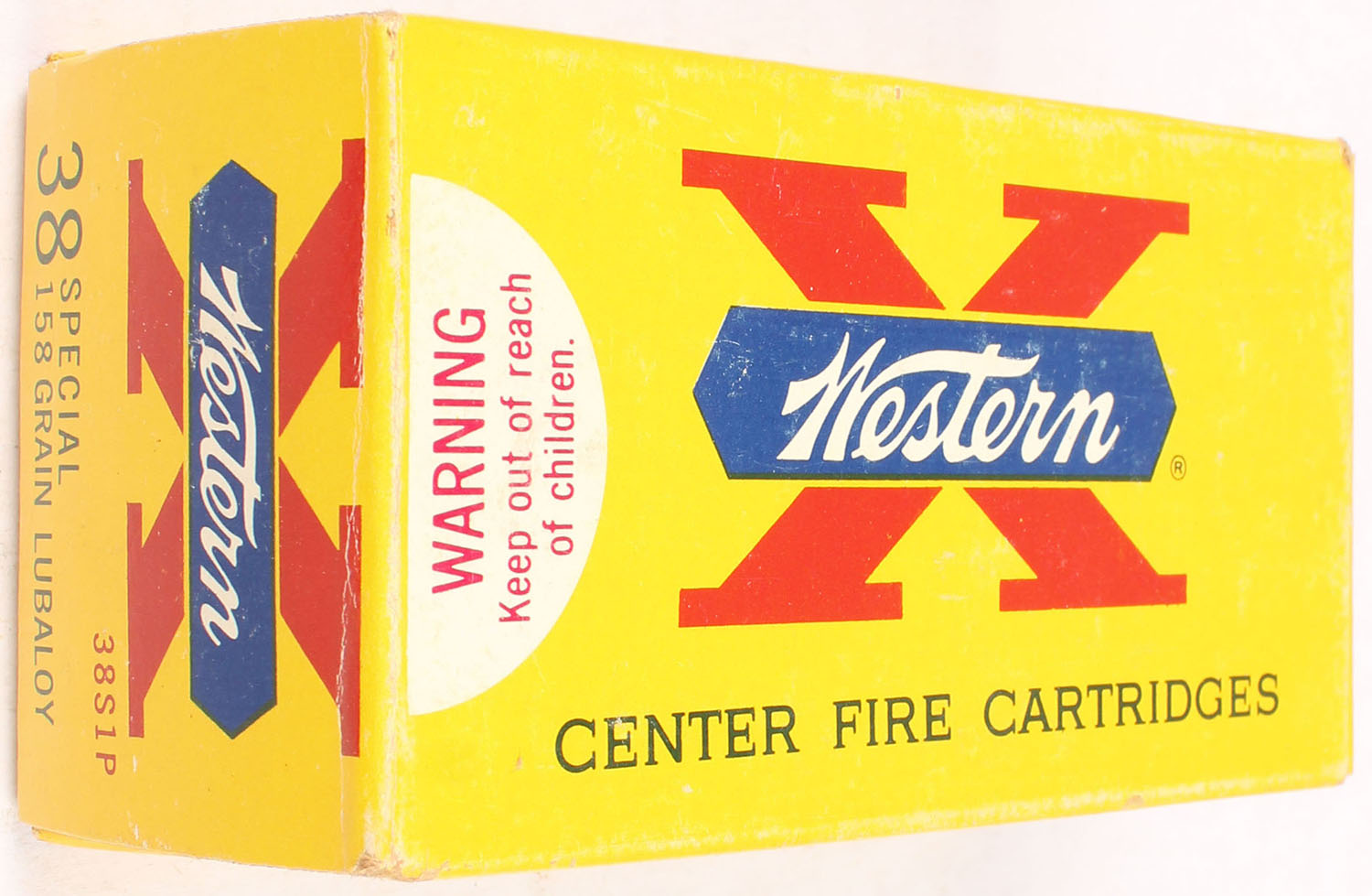 Western, X, .38 Special, 158 Grain Lubaloy, Full, 1pc. Yellow white & red box, box is solid with excellent color, very minor age soiling & corner wear, edges are crisp, end flaps are solid, ammo is excellent. Grade: Excellent + - Value: 20 to 60