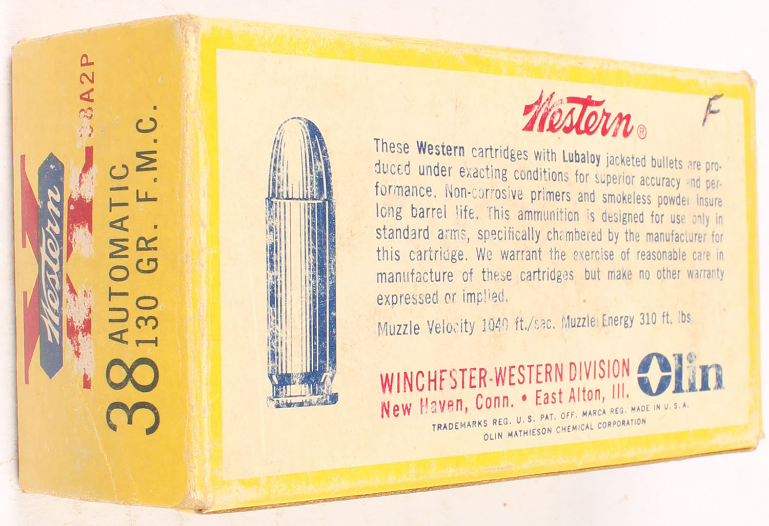 Western, X, .38 Automatic, 130 Grain Full Metal Case, Full, 1pc. Yellow white & red box, box is solid with very good color, minor age soiling, some color fading, very minor shelf & edge wear, minor corner wear, end flaps are solid, ammo is excellent. Grade: Very Good ++ - Value: 20 to 60