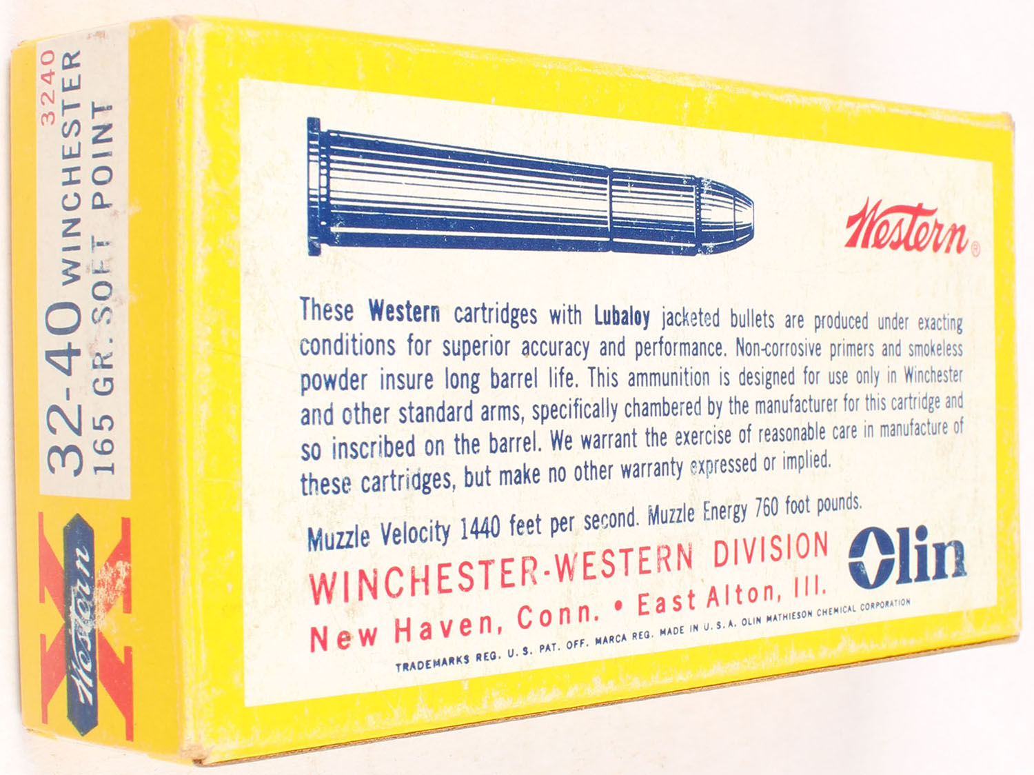 Western, X, .32-40 Winchester, 165 Grain Soft Point, Full, 1pc. Yellow white & red box, box is solid with excellent color, very minor age soiling & corner wear, some shelf wear, edges are mostly crisp, end flaps are solid, ammo is excellent. Grade: Excellent - Value: 30 to 90