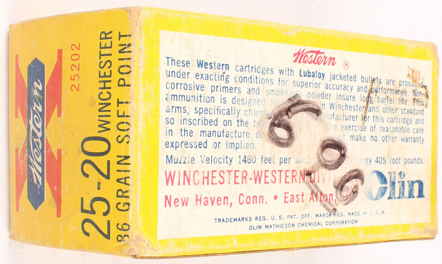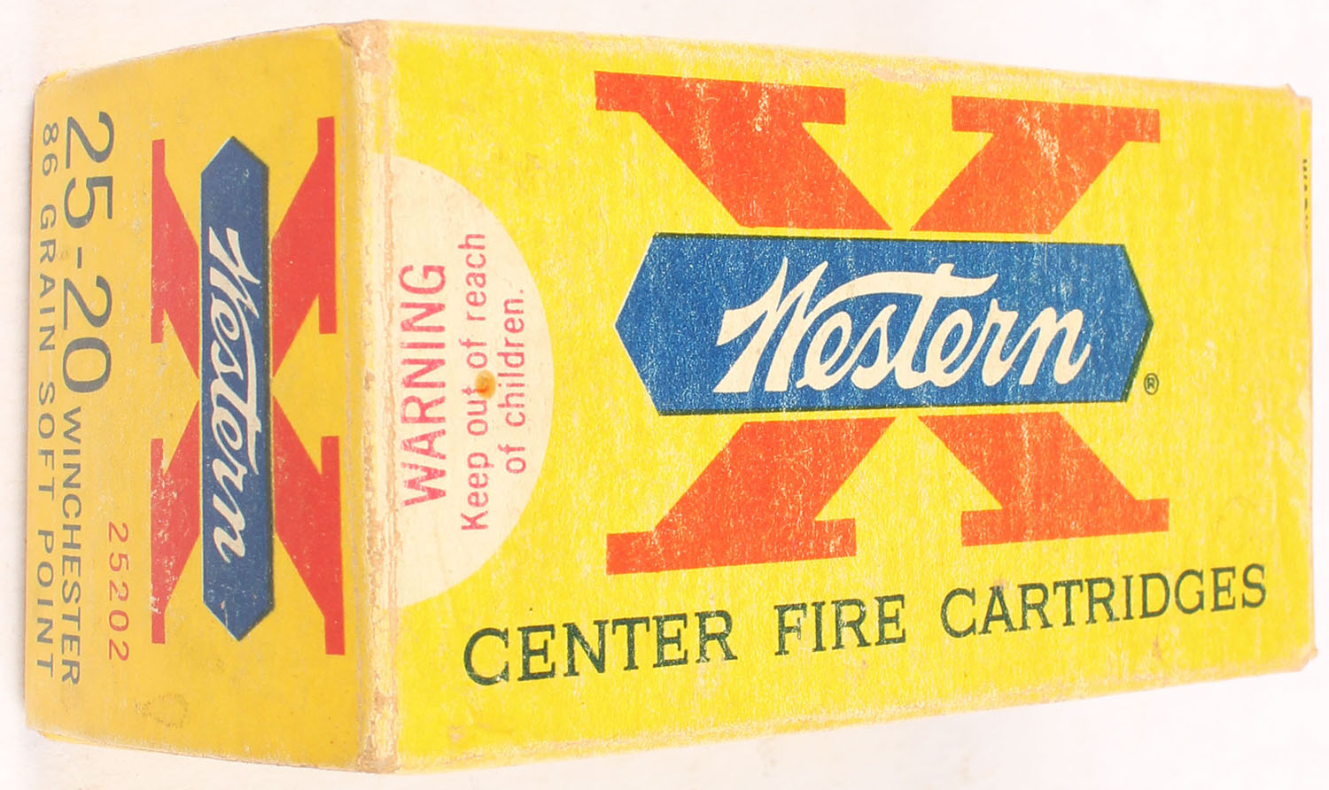 Western, X, .25-20 Winchester, 86 Grain Soft Point, Full, 1pc. Yellow white & red box, box is solid with good to very good color, some age soiling & color fading, very minor corner wear, edges are mostly crisp, end flaps are solid, ammo is excellent. Grade: Very Good ++ - Value: 50 to 150