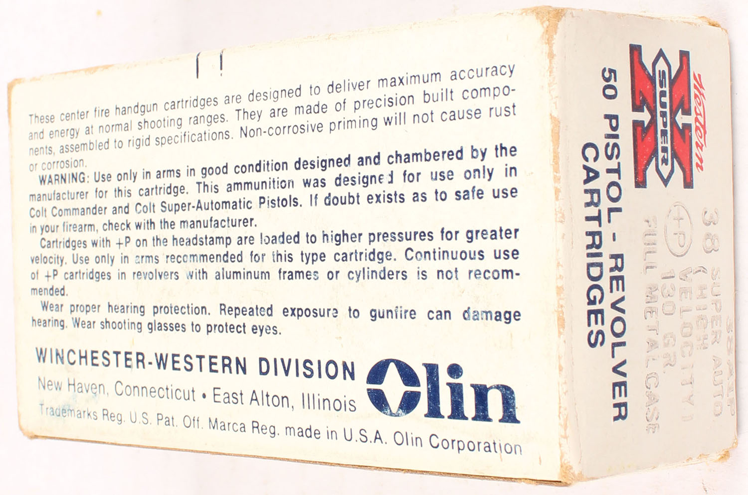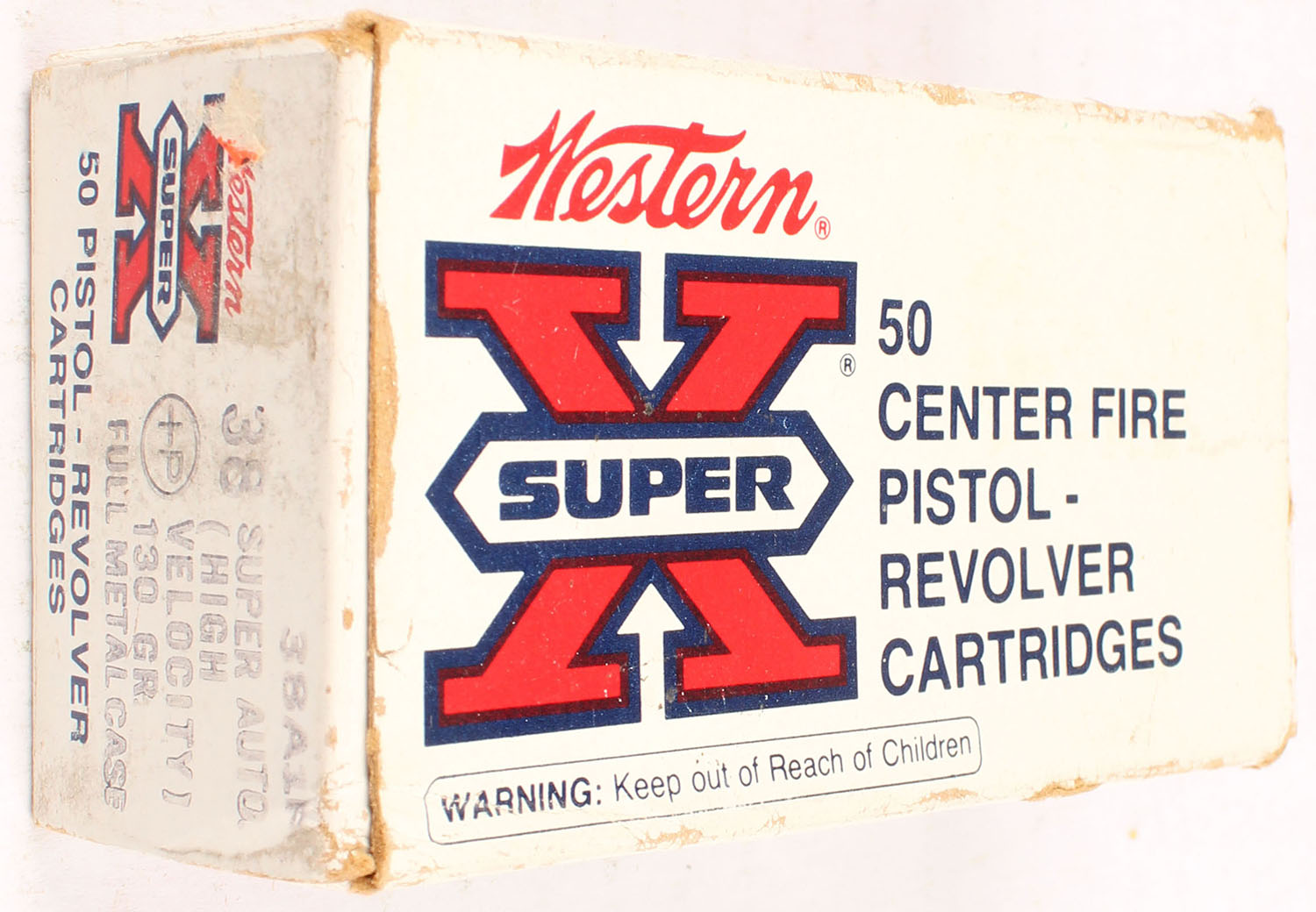 Western, Super X, .38 Super Auto + P, 130 Grain Full Metal Case, Full, 1pc. White red & black box, box is solid with excellent color, very minor shelf wear, some edge & corner wear, end flaps are solid, ammo is excellent. Grade: Very Good ++ - Value: 20 to 60