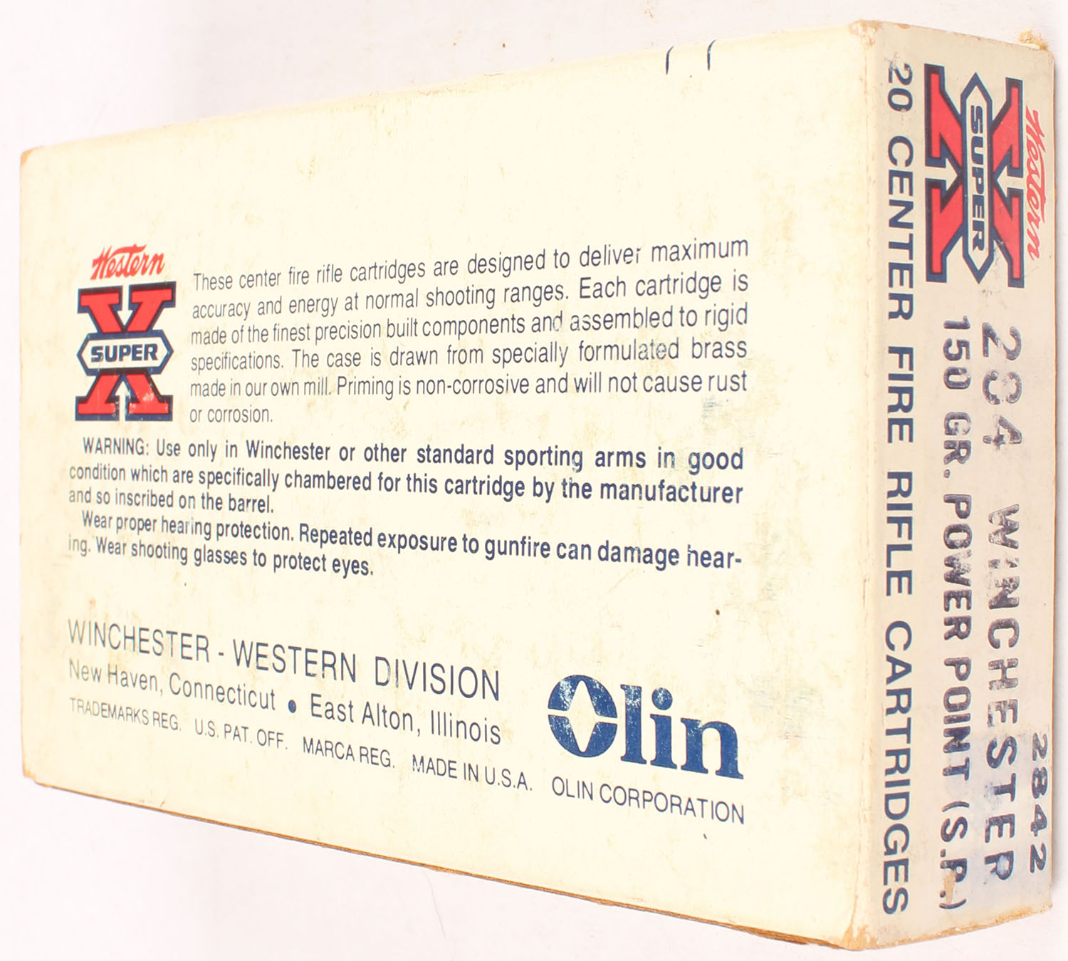 Western, Super X, .284 Winchester, 150 Grain Power-Point, Full, 1pc. White red & black box, box is solid with good color, age soiling, color fading, some shelf wear, minor corner wear, edges are mostly crisp, end flaps are solid, left end flap has been written on, ammo is excellent. Grade: Very Good - Value: 20 to 60