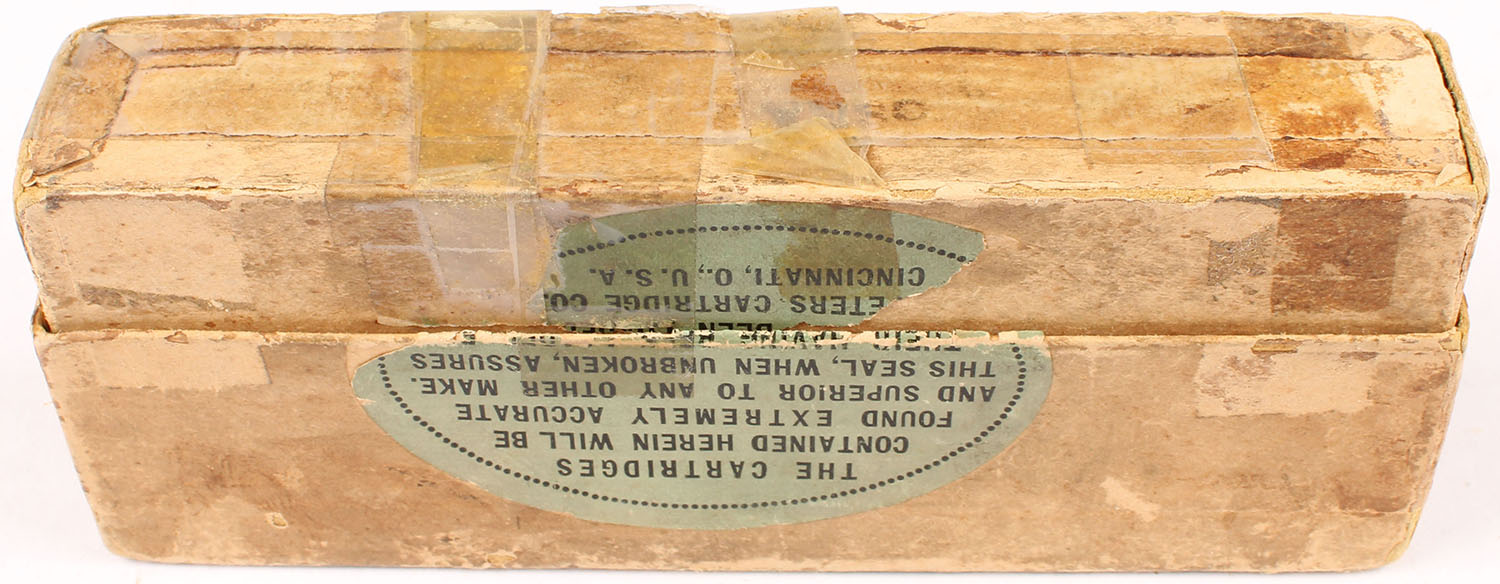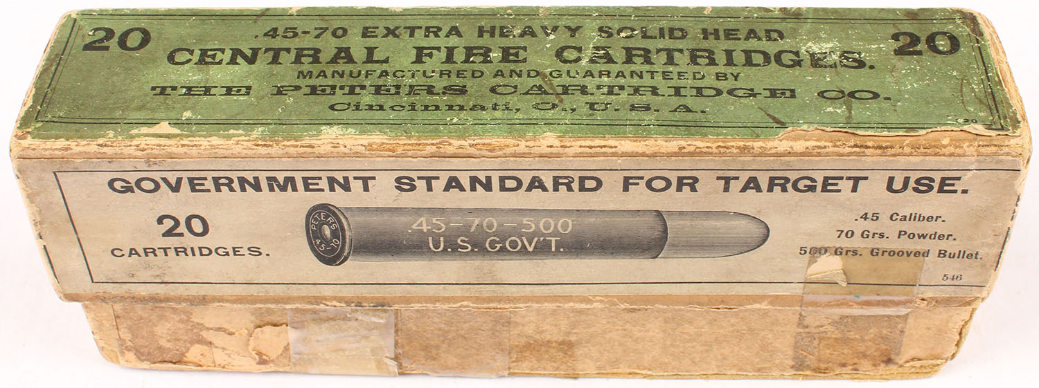 Peters, .45-70-500 U.S. GOV'T, OVERLABEL ''SHOT'', Semi-Smokeless powder, 2pc, Full, buff box with green label & black print, box has multiple partial seam splits & seam tape repairs, light age soiling, rub marks & edge wear, ammo is very good. Grade: Very Good + - Value: 30 to 90