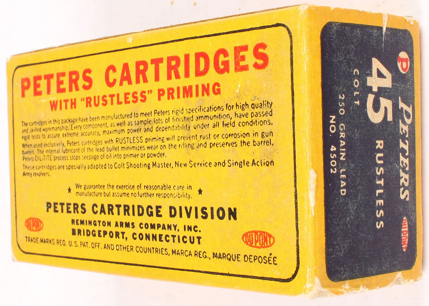 Peters, Rustless, .45 Colt, 250 Grain Lead Bullet, Full, 1pc. Blue yellow & red box, box is solid with very good to excellent color, minor age soiling, some shelf & corner wear, some edge wear, end flaps are solid, ammo is excellent. Grade: Very Good ++ - Value: 20 to 60