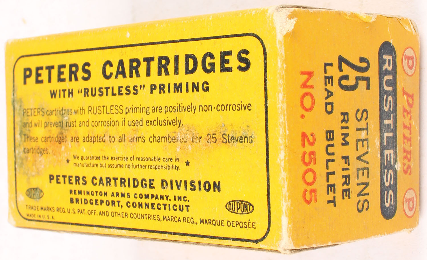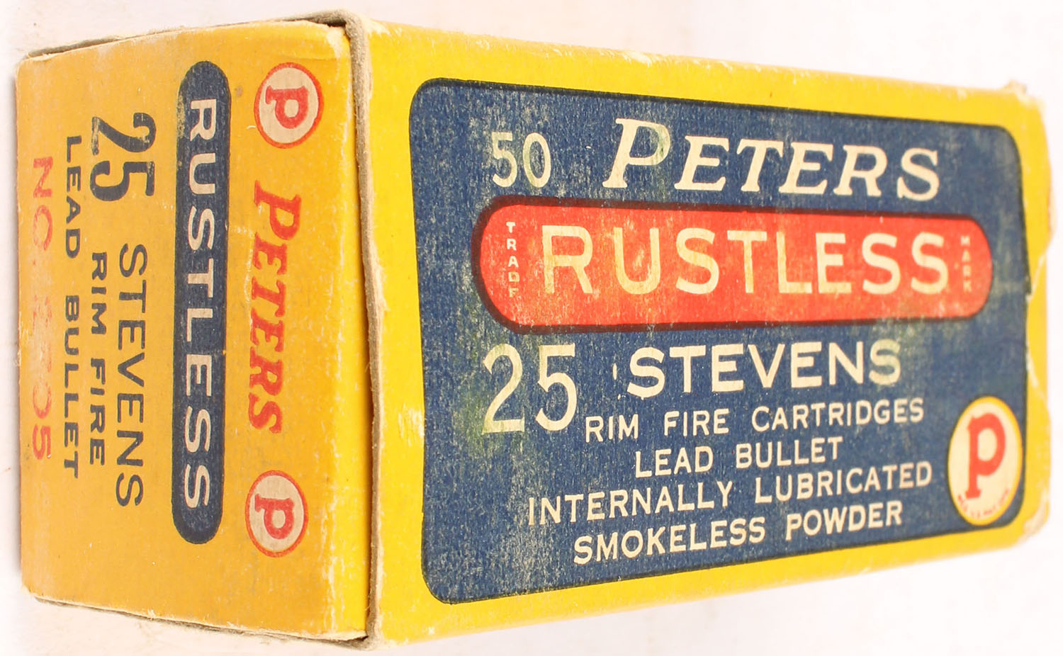 Peters, Rustless, .25 Stevens Rim Fire, Lead Bullet, Full, 1pc. Blue yellow & red box, box is solid with very good color, some age soiling & shelf wear, some corner wear, edges are crisp, end flaps are solid, ammo is excellent. Grade: Excellent - Value: 40 to 120