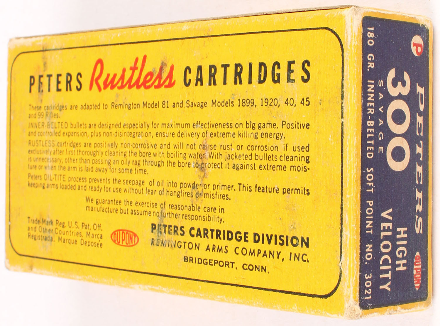 Peters, High Velocity, .300 Savage, 180 Grain Inner-Belted, Soft Point Bullet, Full, 1pc. Blue yellow & red box, box is solid with excellent color, very minor age soiling & shelf wear, minor corner wear, edges are mostly crisp, end flaps are solid, ammo is excellent. Grade: Excellent - Value: 30 to 90
