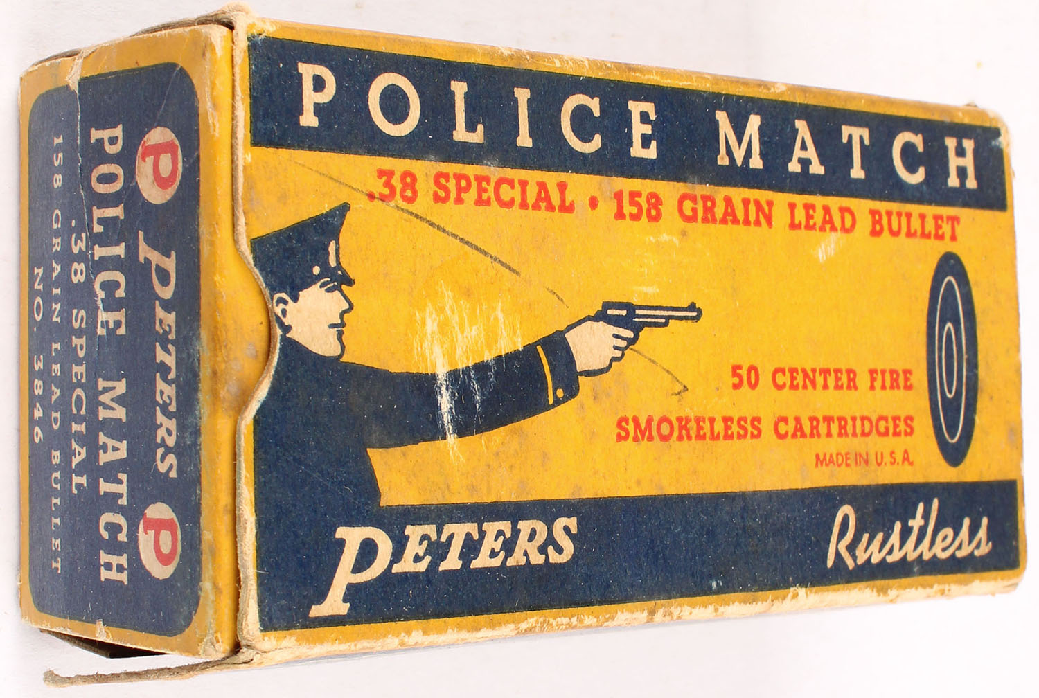 Peters, Police Match, .38 Special, 158 Grain Lead Bullet, Partial 48rds., 1pc. Blue & yellow box, factory seam has unadhered, very good color, age soiling, some shelf wear, some edge & corner wear, end flaps are solid, ammo is excellent. Grade: Very Good - Value: 20 to 60