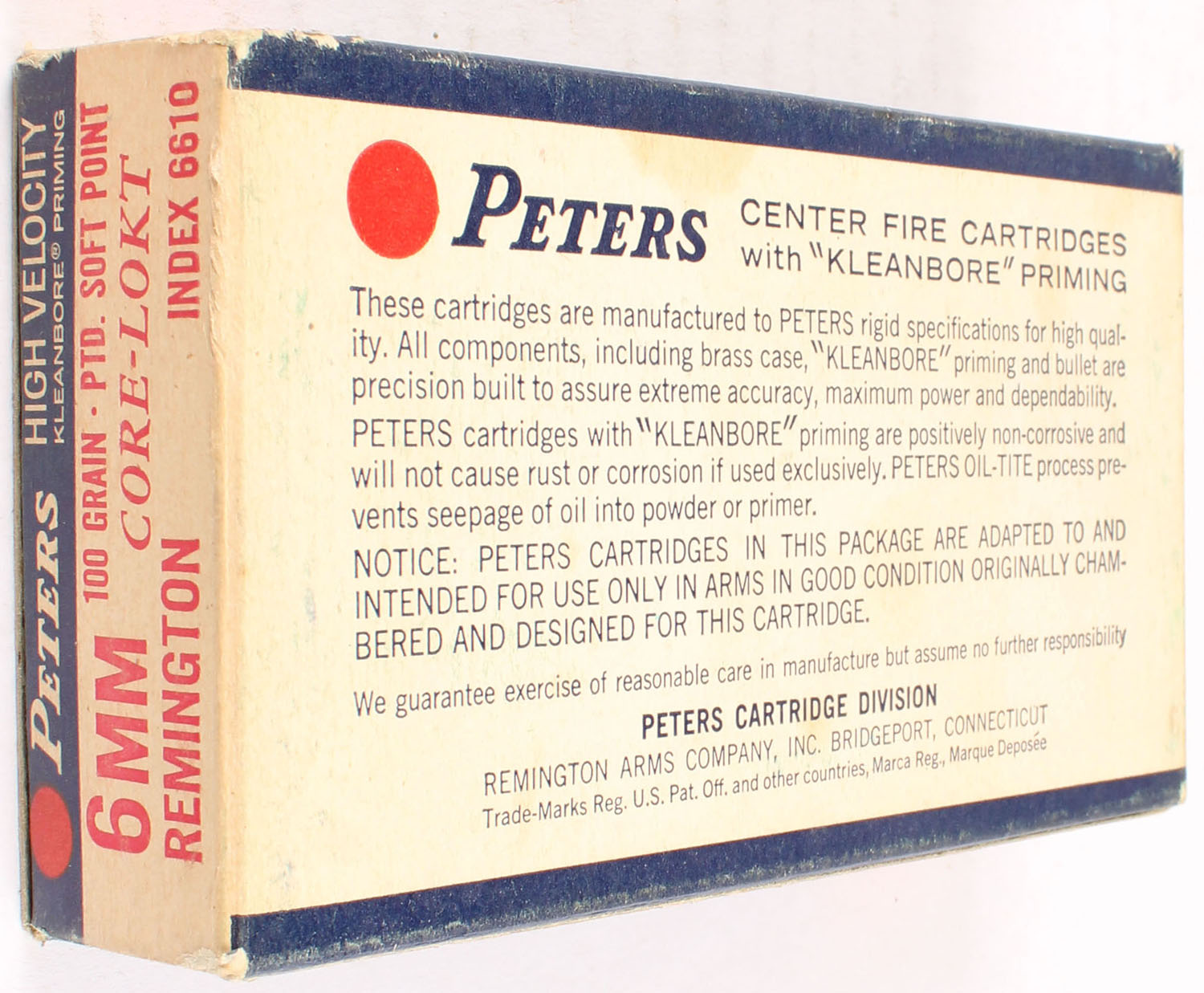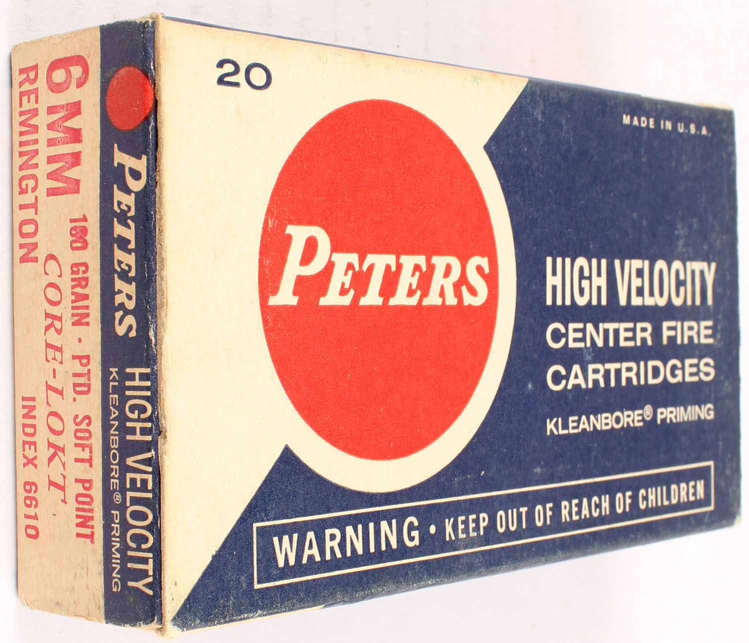 Peters, High Velocity, 6mm Remington, 100 Grain Pointed Soft Point Core-Lokt, Partial 19rds., 1pc. Blue white & red box, box is solid with very good color, some age soiling & shelf wear, minor corner wear, edges are crisp, end flaps are solid, ammo is excellent. Grade: Excellent - Value: 20 to 60