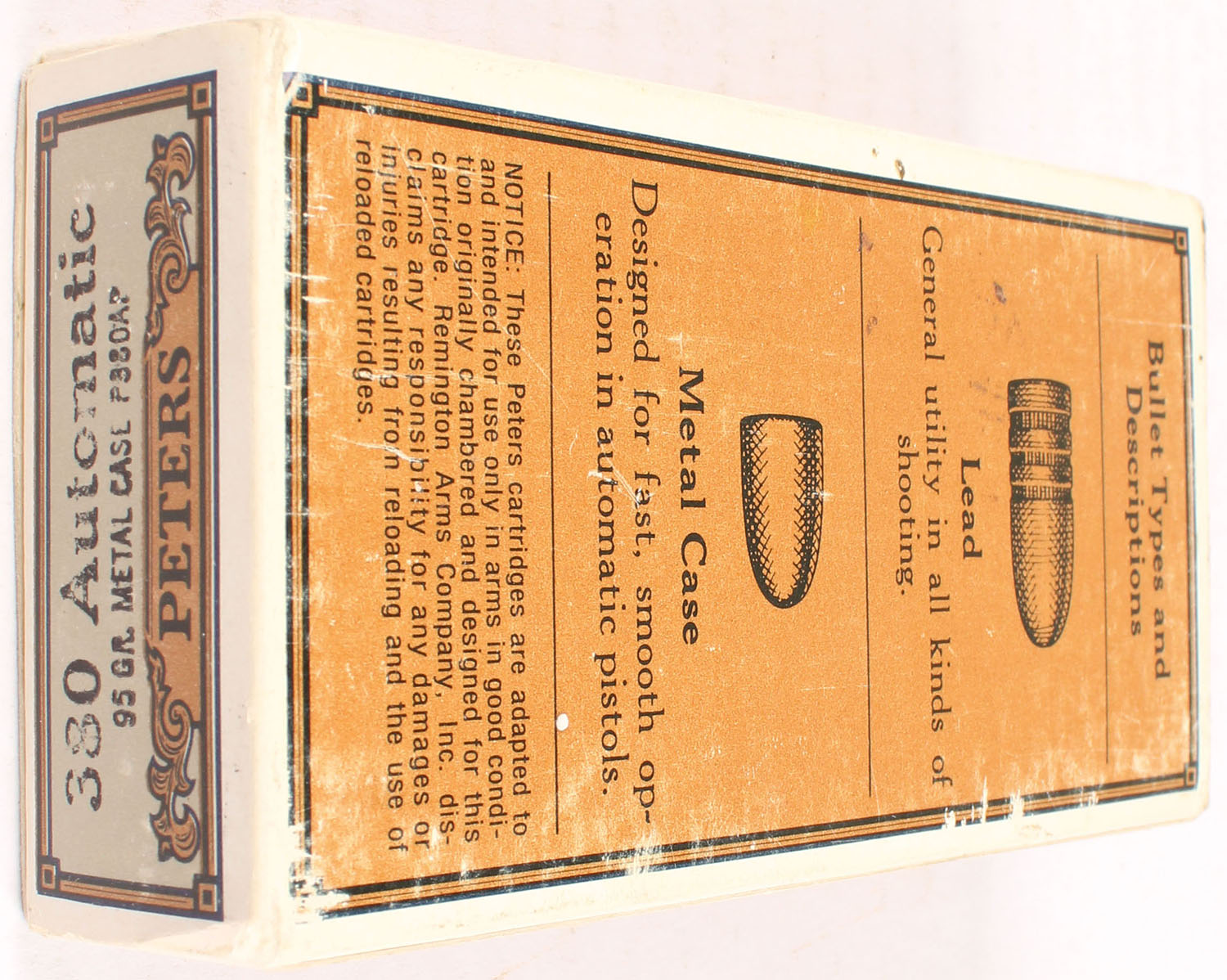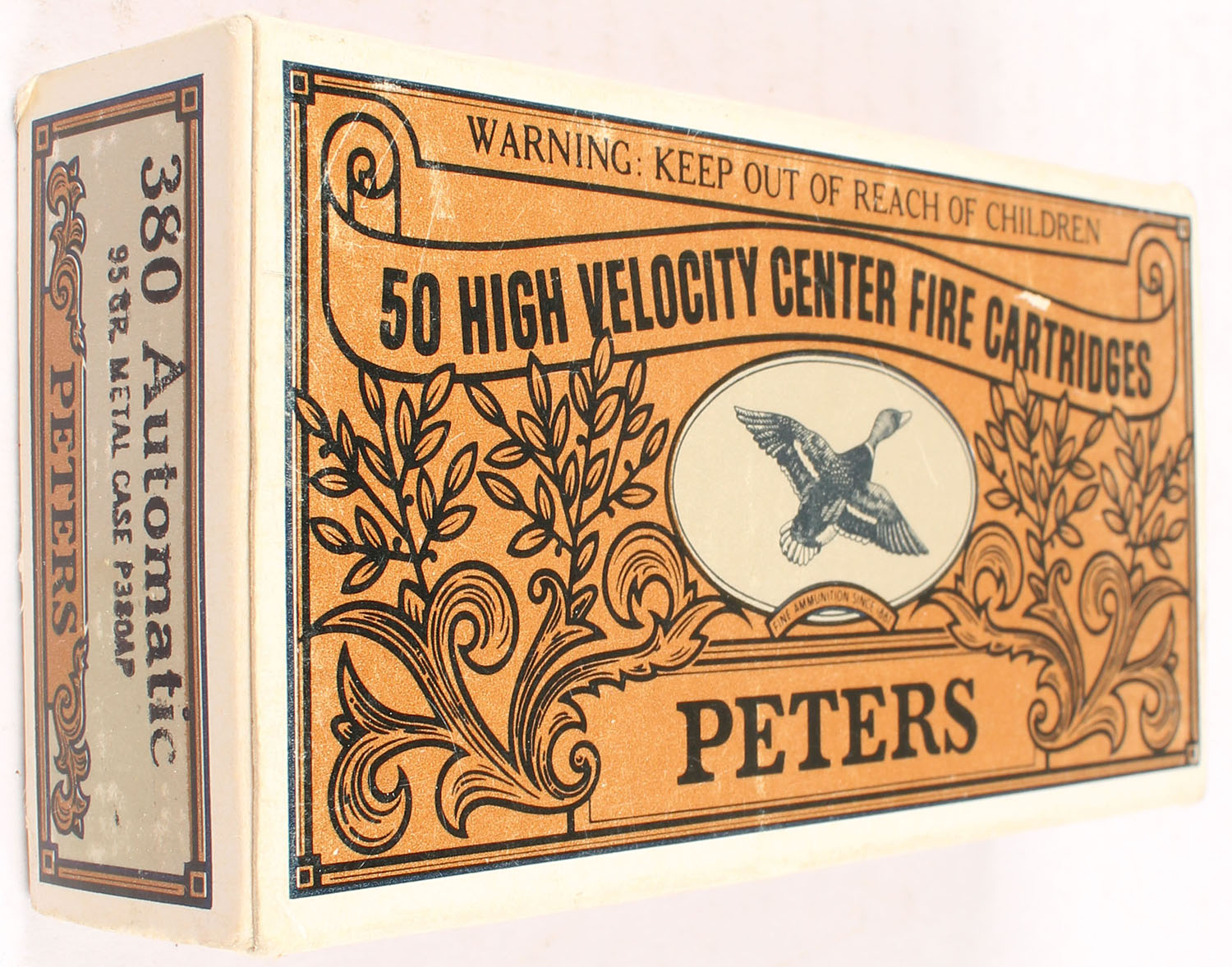 Peters, High Velocity, .380 Automatic, 95 Grain Metal Case, full of mixed H/S, 1pc. Brown & black box, box is solid with excellent color, very minor shelf & corner wear, very minor edge wear, end flaps are solid, ammo is excellent. Grade: Excellent - Value: 10 to 40
