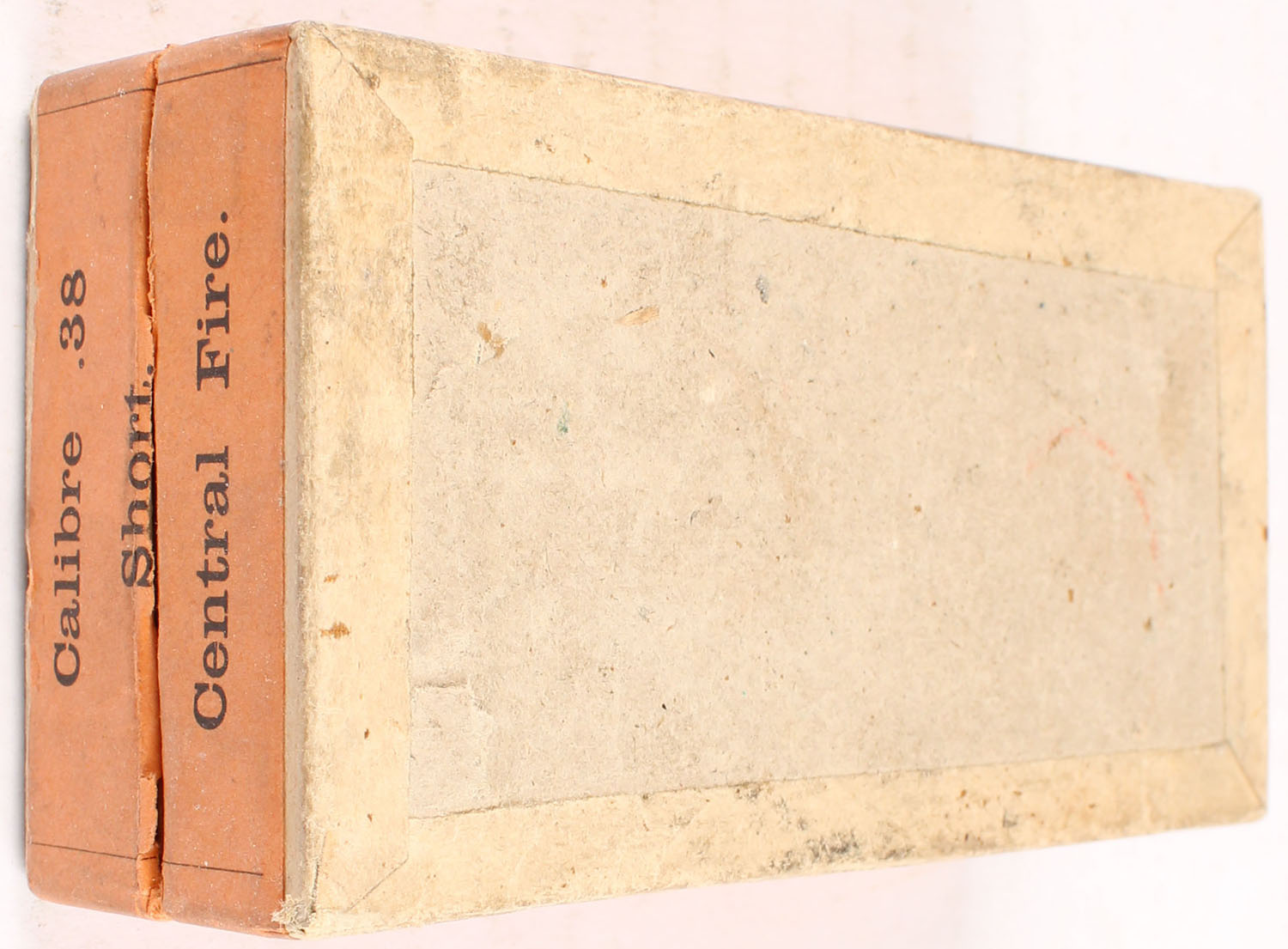 U.S., .38 Short Colt, Central Fire Cartridges, Partial 12rds., 2pc. Buff box with orange top & side sealing labels, box is solid with very good color, some age soiling & color fading, minor edge & corner wear, labels are intact, ammo is good. Grade: Very Good ++ - Value: 8 to 40