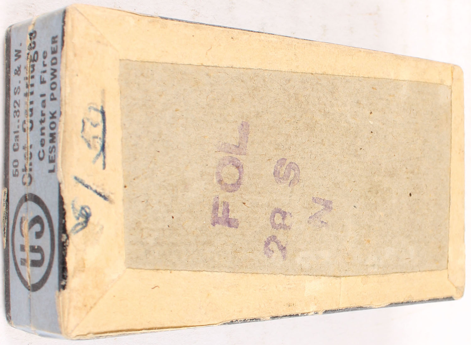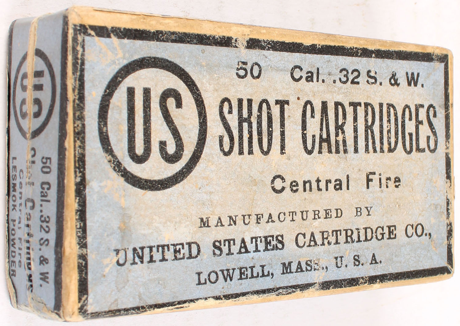 U.S., Shot Cartridges, .32 Smith & Wesson, Central Fire, Full, 2pc. Buff box with blue top & side sealing labels, box is solid with very good color, some age soiling & color fading, minor shelf wear, minor edge & corner wear, labels are intact, ammo is excellent. Grade: Very Good + - Value: 40 to 120