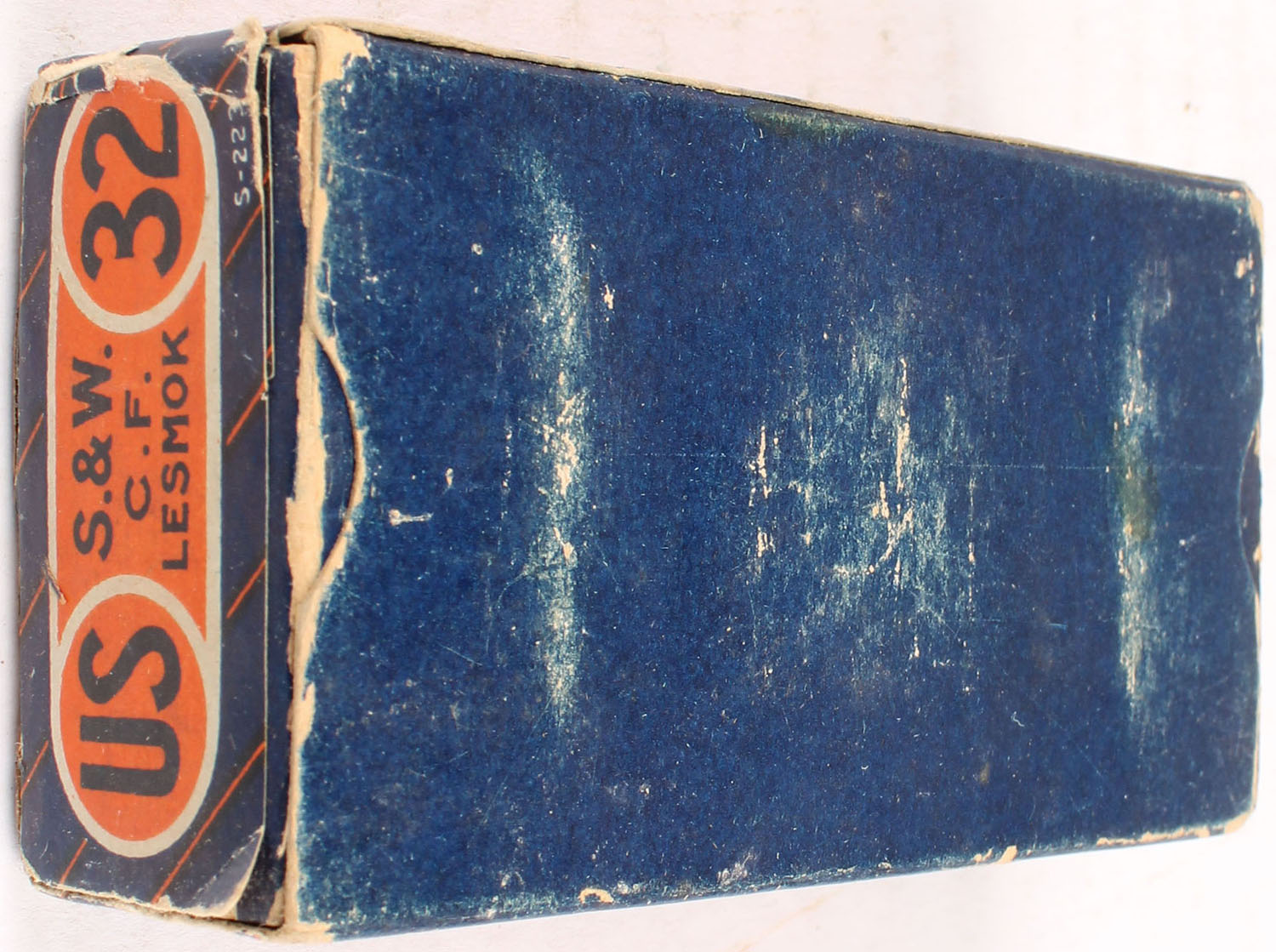 U.S., .32 Smith & Wesson, Central Fire, Lesmok, Full, 1pc. Blue & orange box with blue & orange side sealing label, left end flap is torn, box has very good color, minor age soiling & color fading, top has been written on, some edge & corner wear, right end flap is solid, ammo is very good. Grade: Very Good - Value: 20 to 60