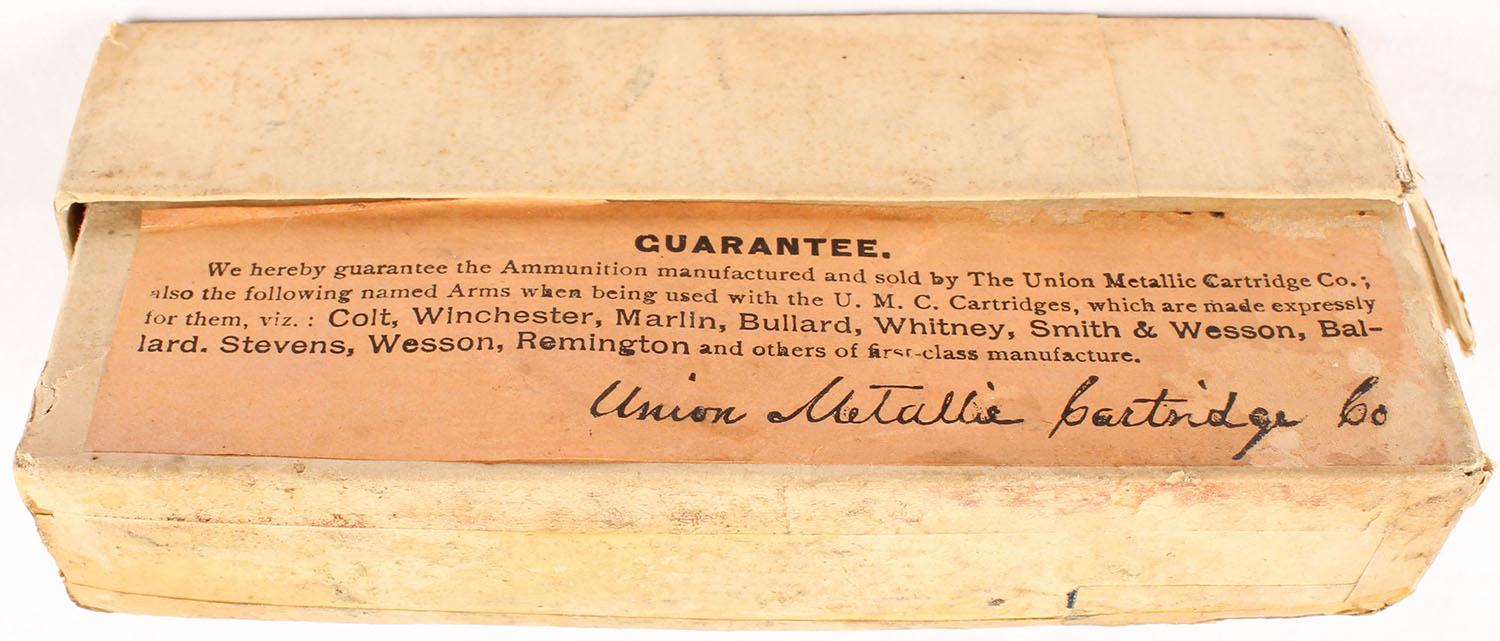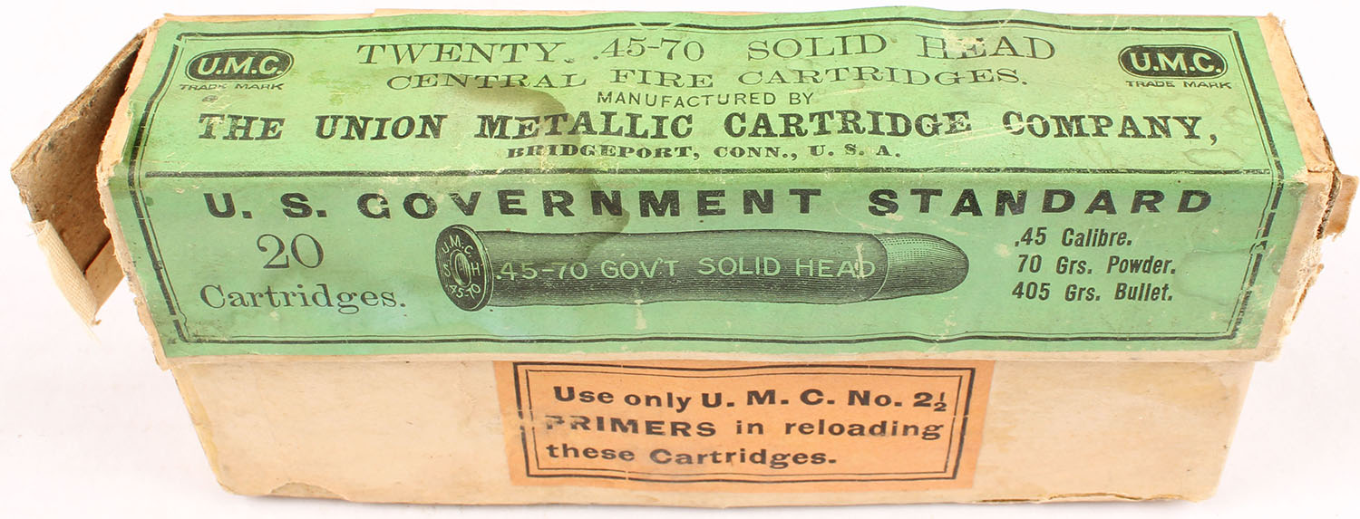 UMC, U.S. Government Standard, .45-70, 405 Grain Solid Head Bullet, Full, 1pc. Buff box with green label, box is solid with very good color, some staining & age soiling, vertical seam splits to both front corners of lid, edge & corner wear, label is intact, ammo is excellent. Grade: Very Good - Value: 40 to 200