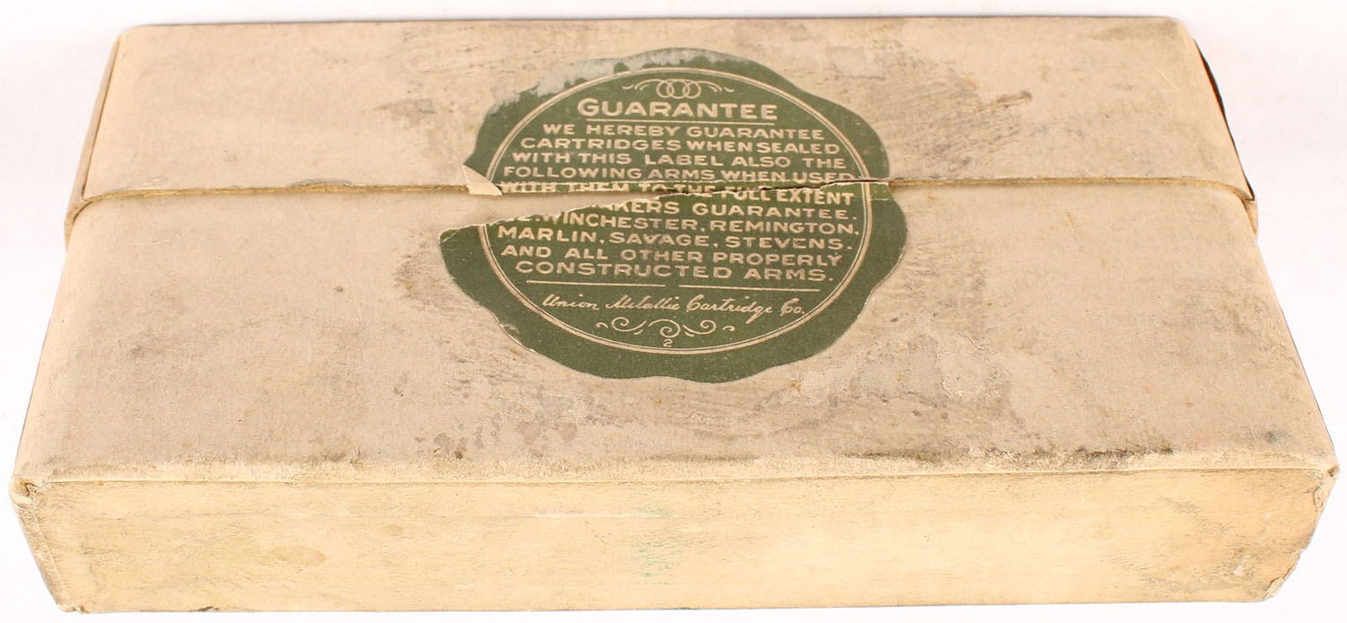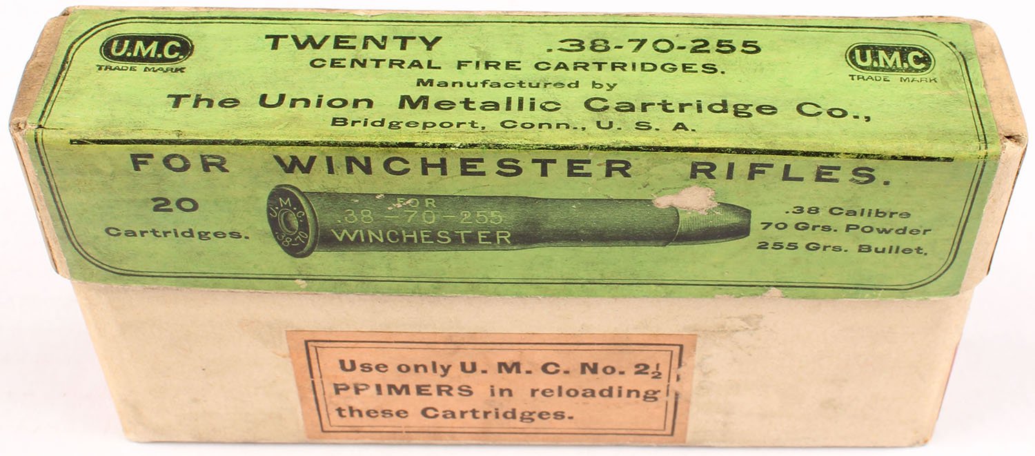 UMC, For Winchester Rifles, .38-70 Winchester, 255 Grain Bullet, Full, 2pc. Buff box with green label, box is solid with very good color, some age soiling & shelf wear, minor edge & corner wear, label is intact, ammo is excellent. Grade: Excellent - Value: 30 to 90