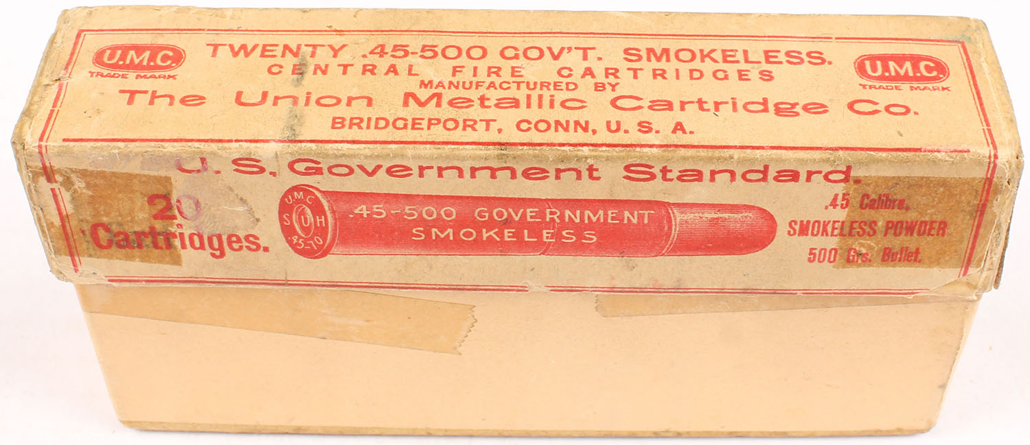 UMC, U.S. Government Standard, .45-500 (.45-70), 500 Grain Bullet, Full, 2pc. Buff box with buff & red label, box is solid with very good color, some age soiling, tape on front, some edge & corner wear, label is intact, ammo is excellent. Grade: Very Good + - Value: 20 to 60