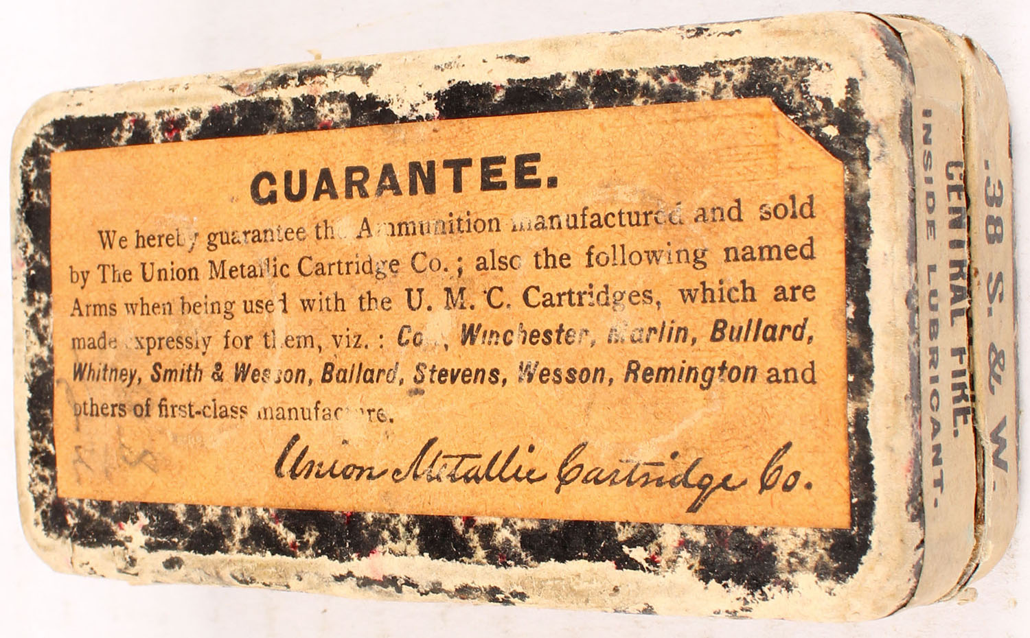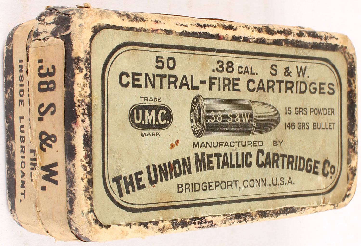 UMC, Central-Fire Cartridges, .38 Smith & Wesson, 15 Grs. Powder, 146 Grs, Bullet, Partial 30rds. Of mixed H/S, 2pc. Black mottled box with gray top & buff side sealing labels, box is solid with very good color, some age soiling, some edge & corner wear, side sealing label is 95% intact, ammo is good. Grade: Good ++ - Value: 10 to 50