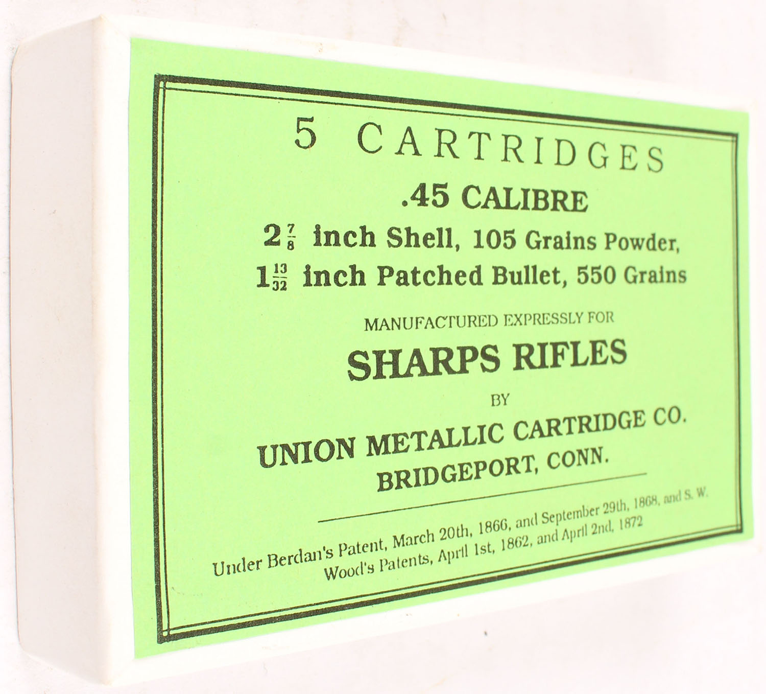 UMC, Sharps Rifles, .45 Calibre, 105 Grains Powder, 550 Grain Patched Bullet, Full, 2pc. White replica box with green top label, box is MINT with mint color, corners are sharp, edges are crisp, label is intact, ammo (RWA H/S) is minty. Grade: MINT - Value: 20 to 100