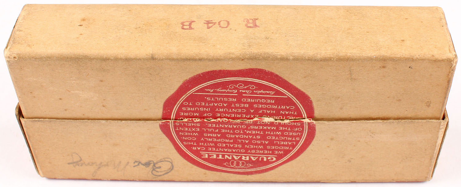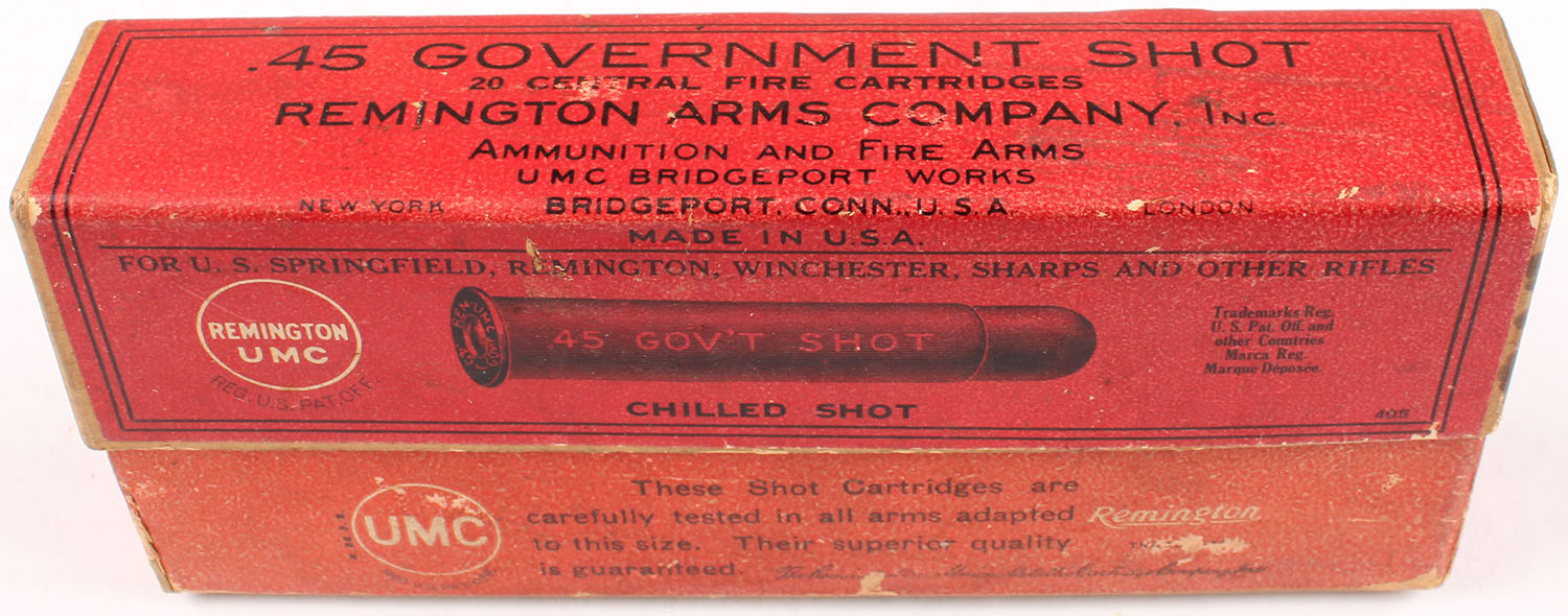 REM-UMC, .45 Government Shot, Chilled Shot, Full, 2pc. Buff box with red labels, box is solid with excellent color, minor age soiling & shelf wear, very minor corner wear, edges are crisp, labels are intact, ammo is excellent. Grade: Excellent - Value: 40 to 120