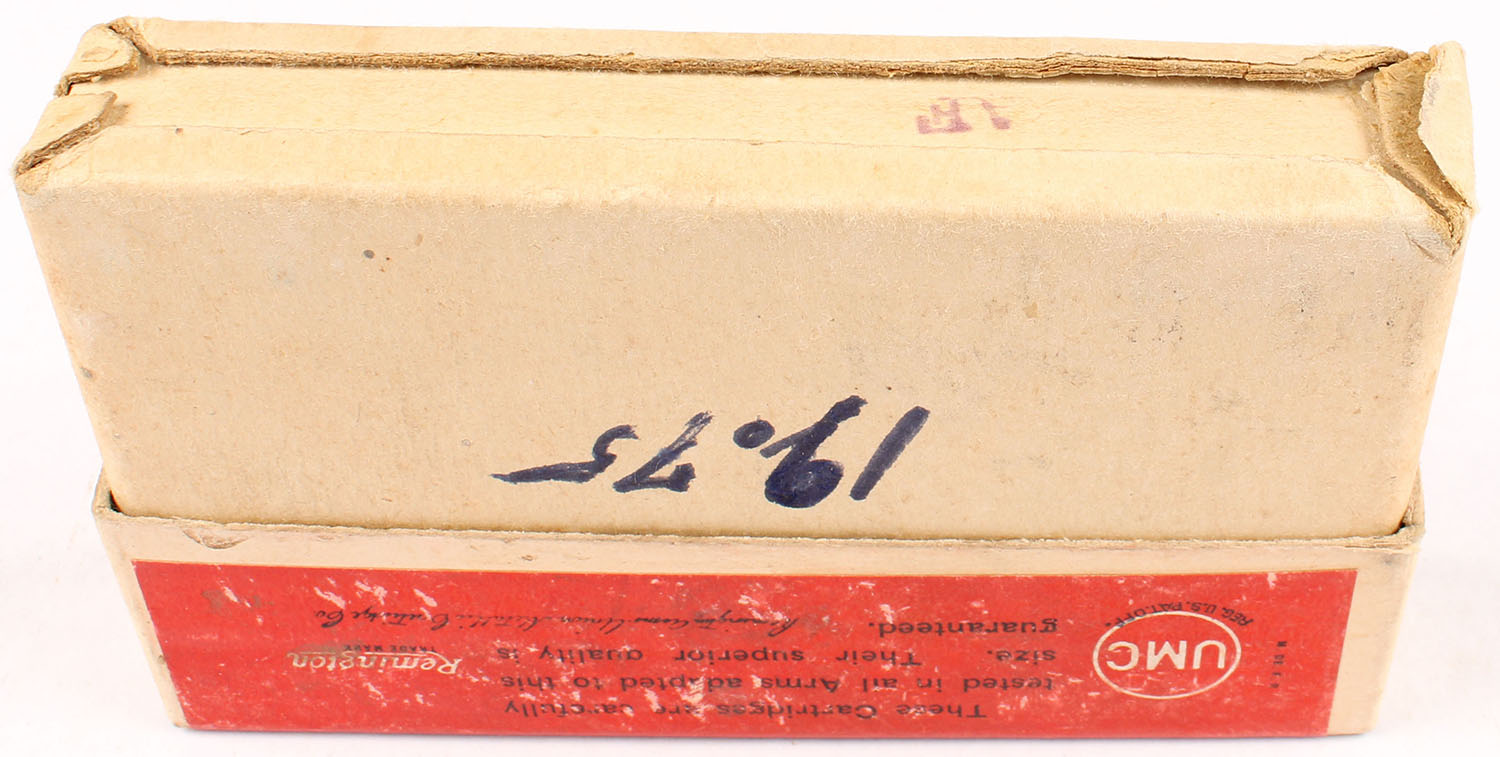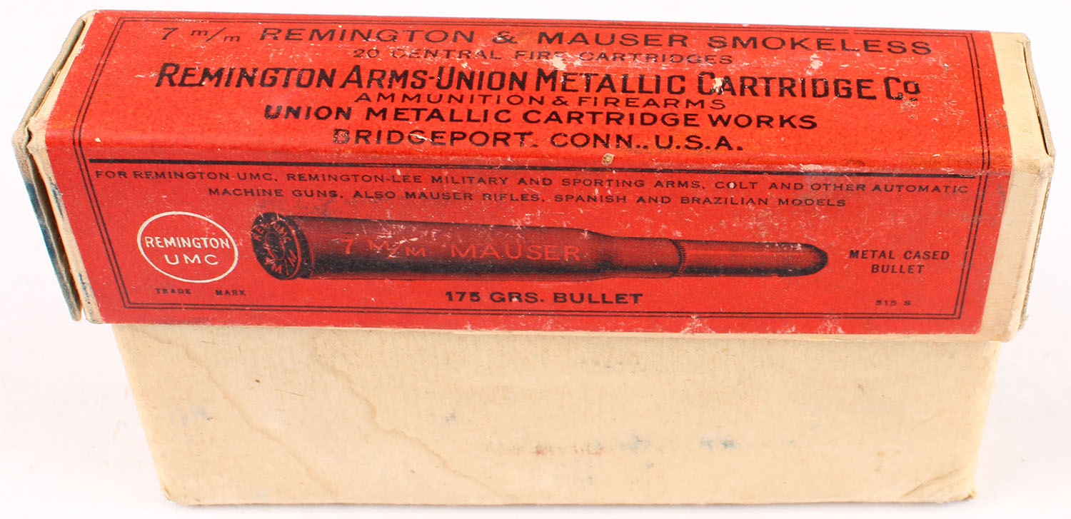 REM-UMC, 7mm Mauser, Smokeless, 175 Grain Metal Cased Bullet, Full, 2pc. Buff box with red label, box is solid with excellent color, minor shelf wear & staining, minor corner wear, edges are crisp, label is intact, ammo is very good to excellent. Grade: Excellent - Value: 30 to 90